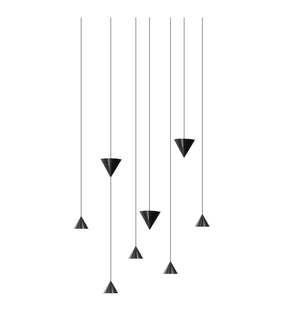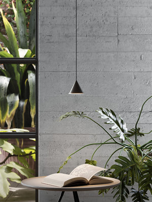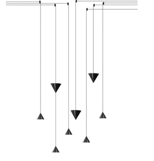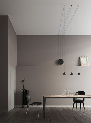 Filomena is a system of suspensions and appliques that unfolds from a simple little cone of black aluminum. The cone diffuser is the starting point for climbing ceilings and walls, and can be suspended at various heights thanks to long thin cables that allow for different refined combinations. The cable can hold even two cone bodies that diffuse the light, one smaller with the beam pointing down and the other one, larger, pointing up, distanced as needed and attached to the ceiling or wall with special black aluminum clamp. The drivers can be placed on the floor or embedded in the wall.