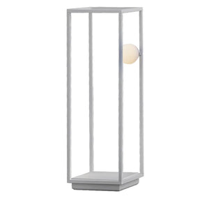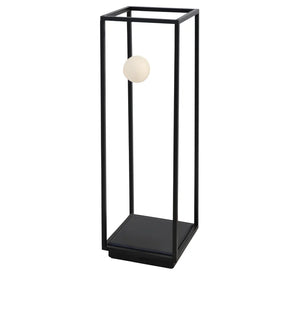 These contemporary LED lanterns are available as a floor lamp or in an applique version. The aluminum metal frame is painted in matt white or black, and white blown delicate glass spheres of various sizes are attached to the frame. They can be placed on either side of an entrance to create the appropriate mood for a home or garden. A small tray at the top can be used to place vases or small items, and a hole in the top of it allows for the placement of a cable for charging electronic devices. The rechargeable battery version is ideal for terraces and outdoor areas.