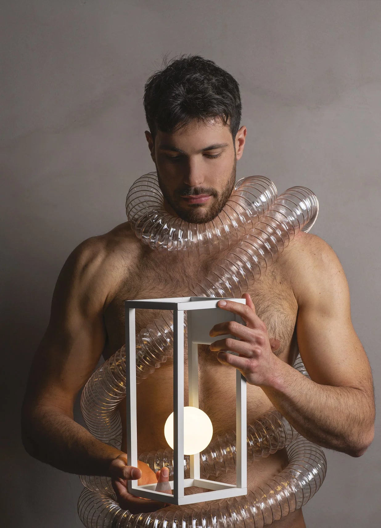 These contemporary LED lanterns are available as a floor lamp or in an applique version. The aluminum metal frame is painted in matt white or black, and white blown delicate glass spheres of various sizes are attached to the frame. They can be placed on either side of an entrance to create the appropriate mood for a home or garden. A small tray at the top can be used to place vases or small items, and a hole in the top of it allows for the placement of a cable for charging electronic devices. The rechargeable battery version is ideal for terraces and outdoor areas.