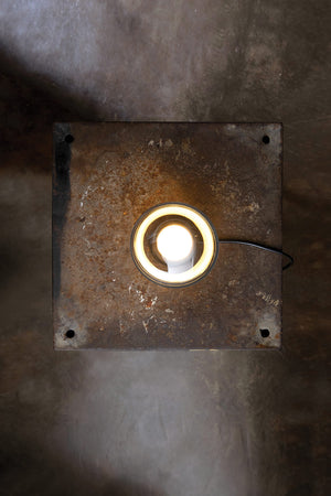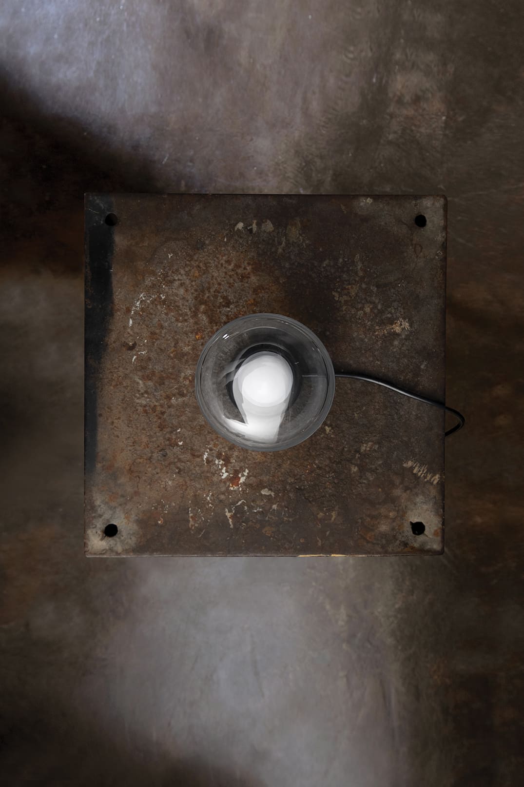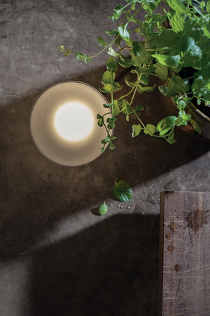 A circular shaped, mouthblown, thick glass spot, transparent or satin-finished. Agua can be used as a table or wall lamp to create a halo on a wall or other reflective surface. The base is in black anodized aluminum with an internal cap diffuser to protect the LED light source. It can be placed in geometric or random patterns, as a one-point light on a side table, or in a hidden corner of the house or garden.