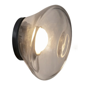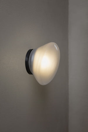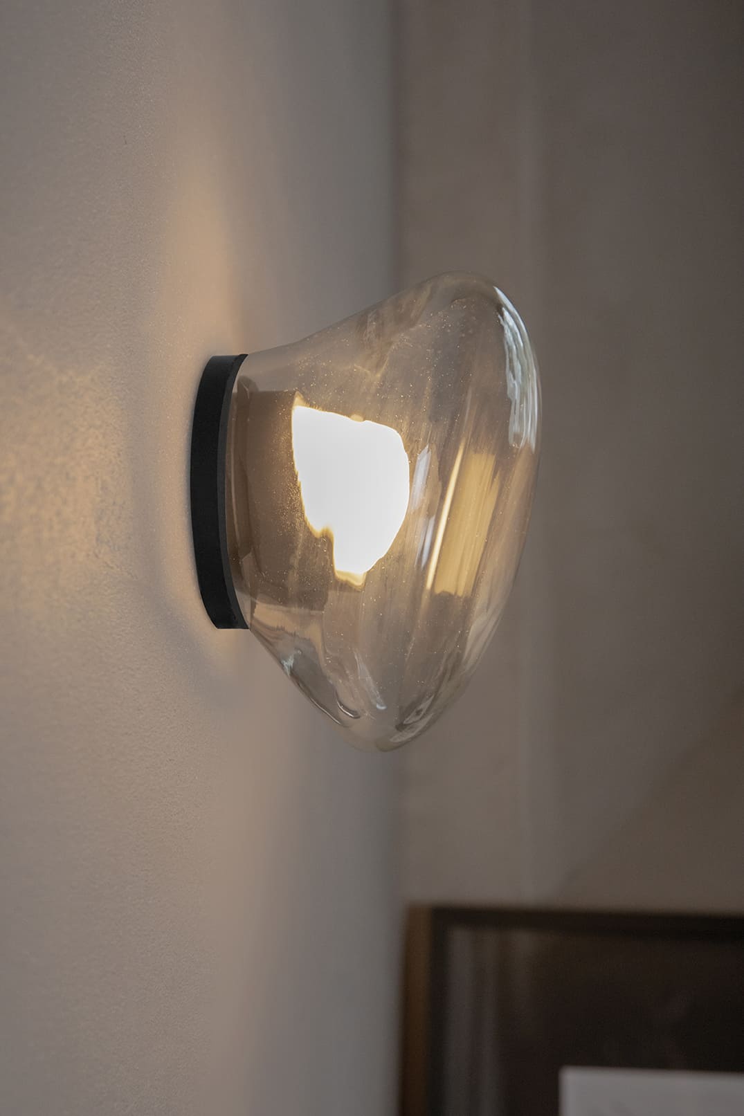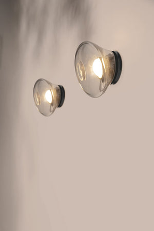 A circular shaped, mouthblown, thick glass spot, transparent or satin-finished. Agua can be used as a table or wall lamp to create a halo on a wall or other reflective surface. The base is in black anodized aluminum with an internal cap diffuser to protect the LED light source. It can be placed in geometric or random patterns, as a one-point light on a side table, or in a hidden corner of the house or garden.