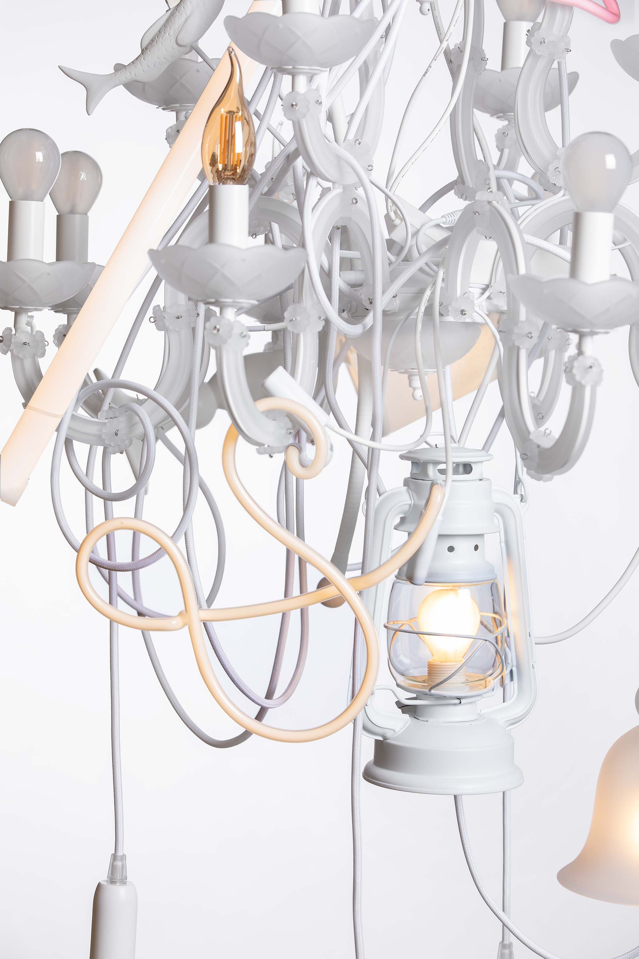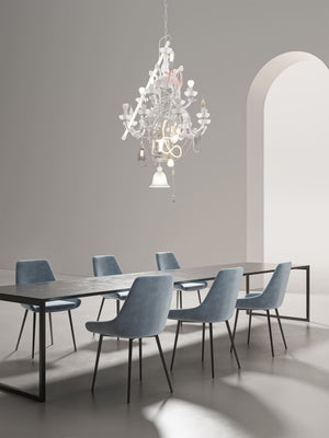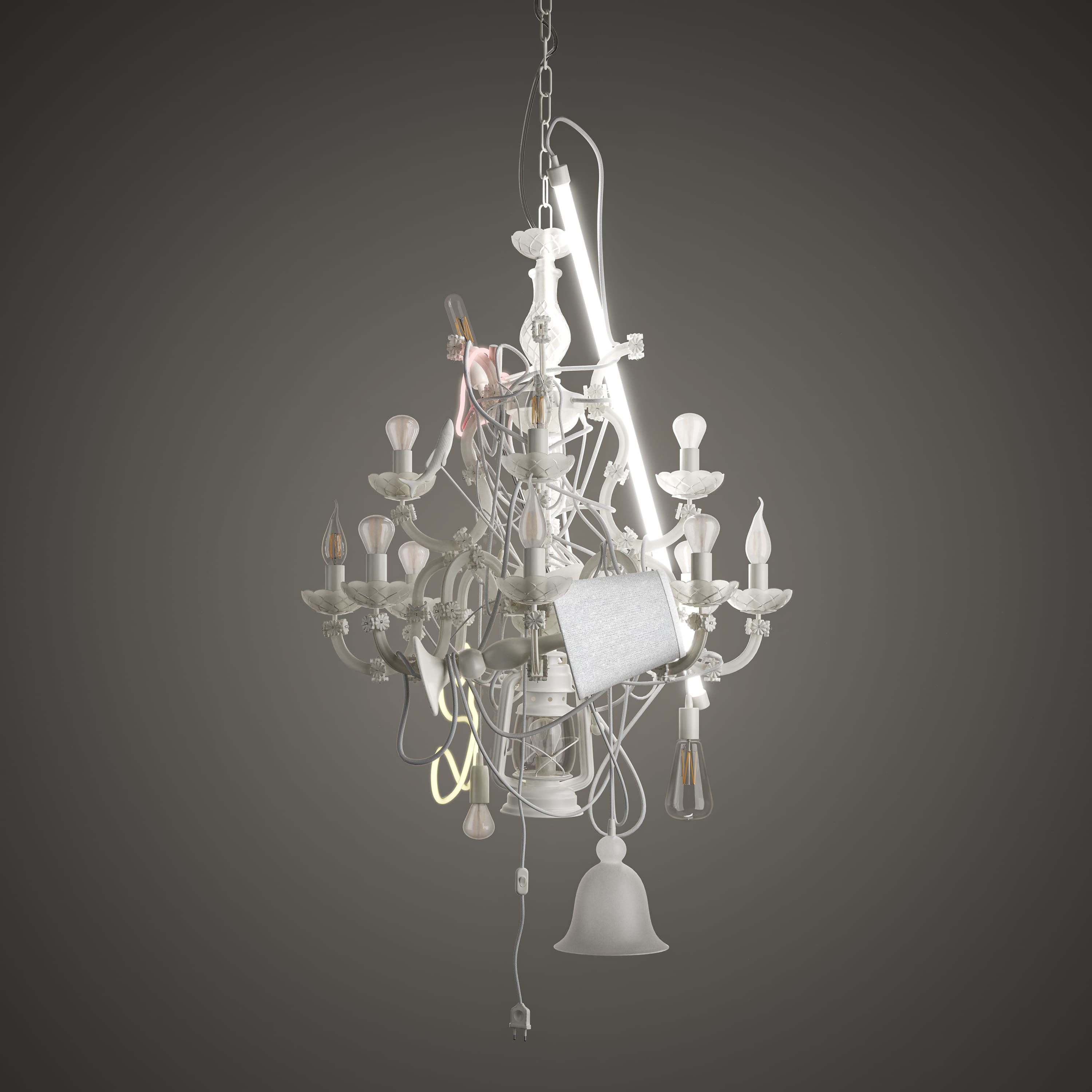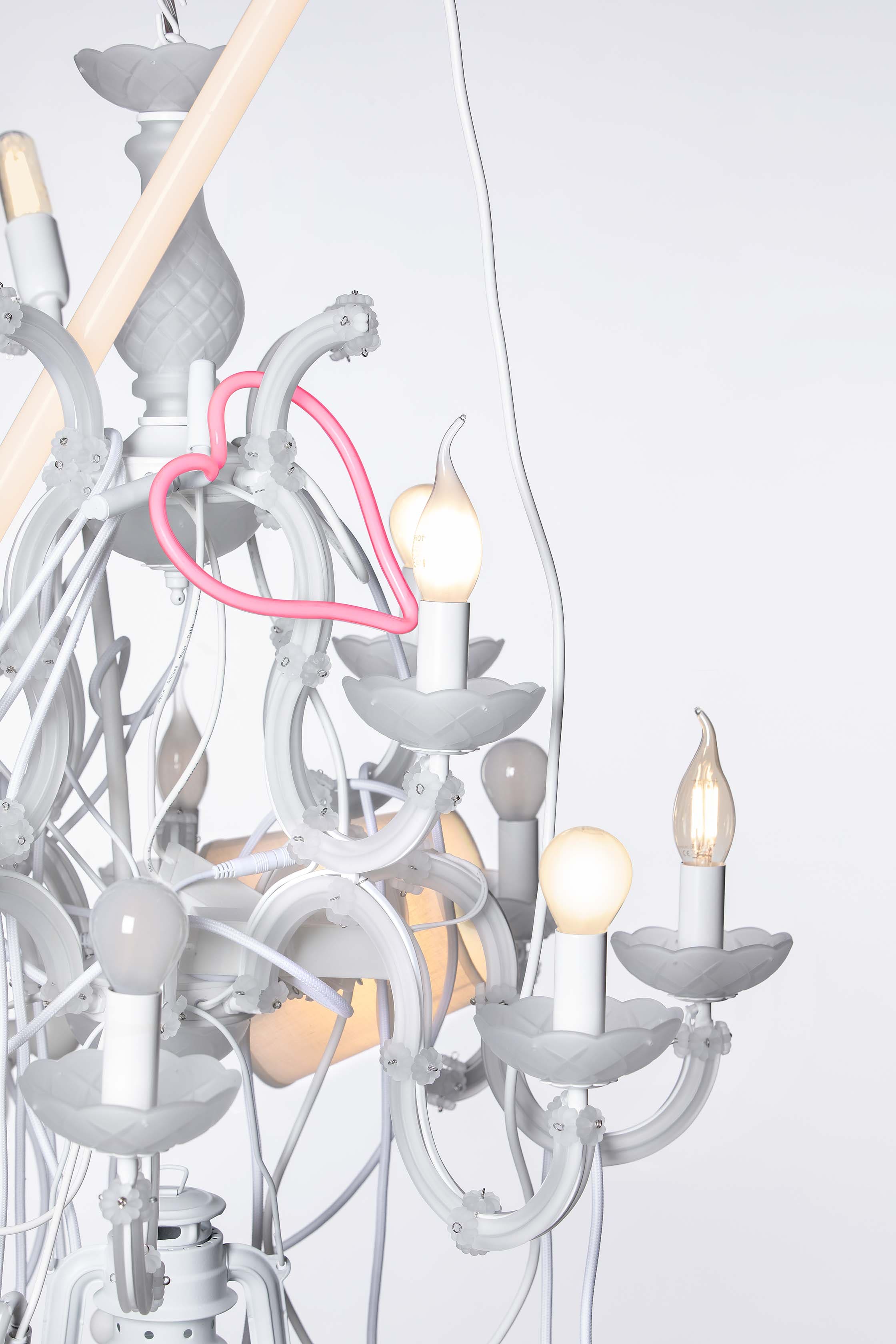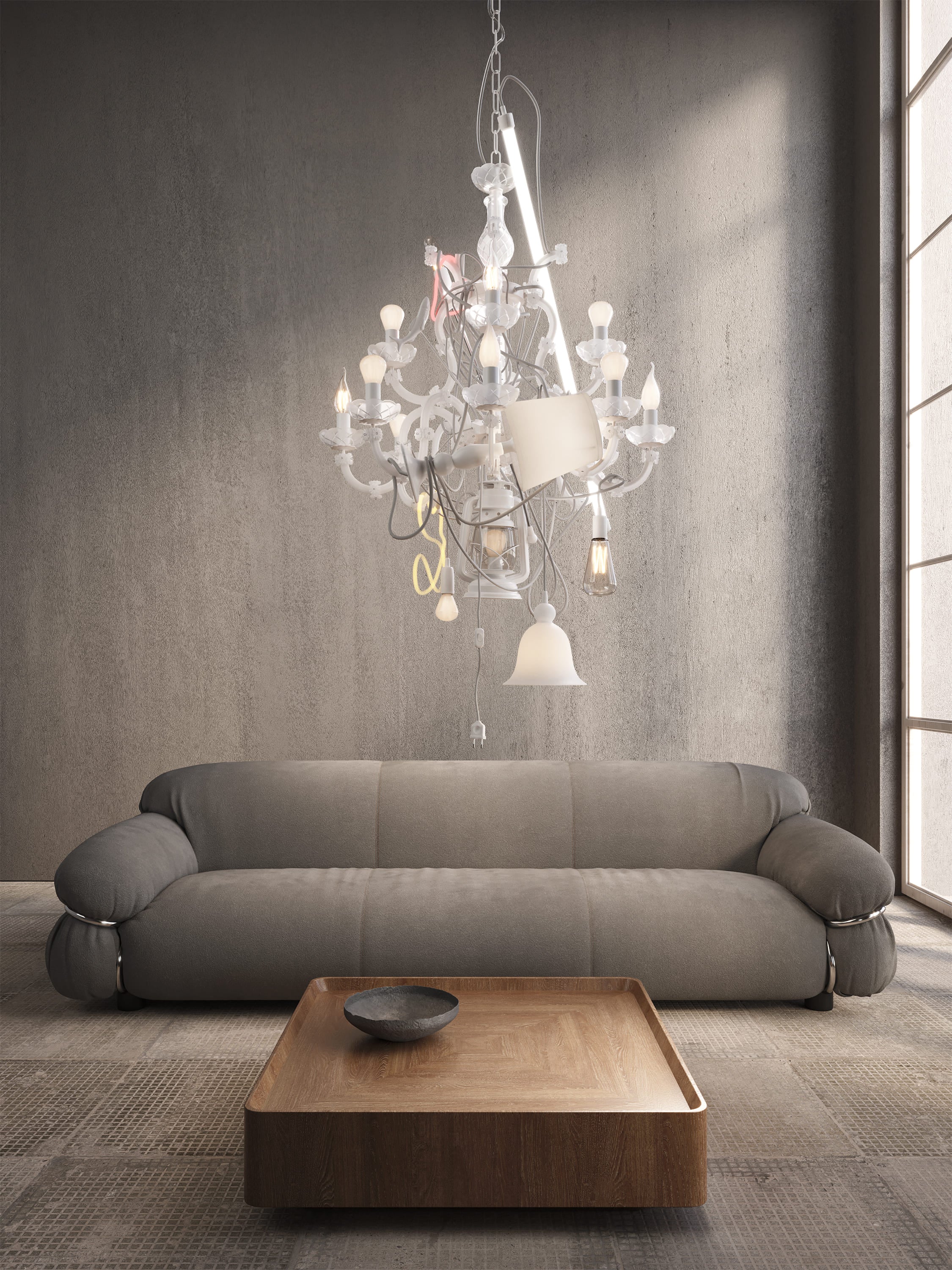 Just like the “creature”, the canonical elements are all here – a supporting structure, arms, lamps, and a cable – but Marcantonio’s irreverent borderline approach, somewhere between art and design, has brought to life a new, deconstructed silhouette, created by mixing shapes, materials, and styles, all apparently belonging to the semantic area of lighting, although from different times and places. Lots of Murano blown glass arms with a white frosted finish emerge from the central structure in white metal; the joints have rosettes and bobeches in crystal from Bohemia, stolen from the mid-18th century traditions of Venice. As ideal pendants, the designer has inserted a gas lamp, a classic bedside lamp with fabric shade, a glass bell, a lamp with a flexible arm, and even a 1980s-style neon bar. The mix also has no shortage of little “intruders” like a leaping fish in glass and a pink neon heart, providing the only note of colour.