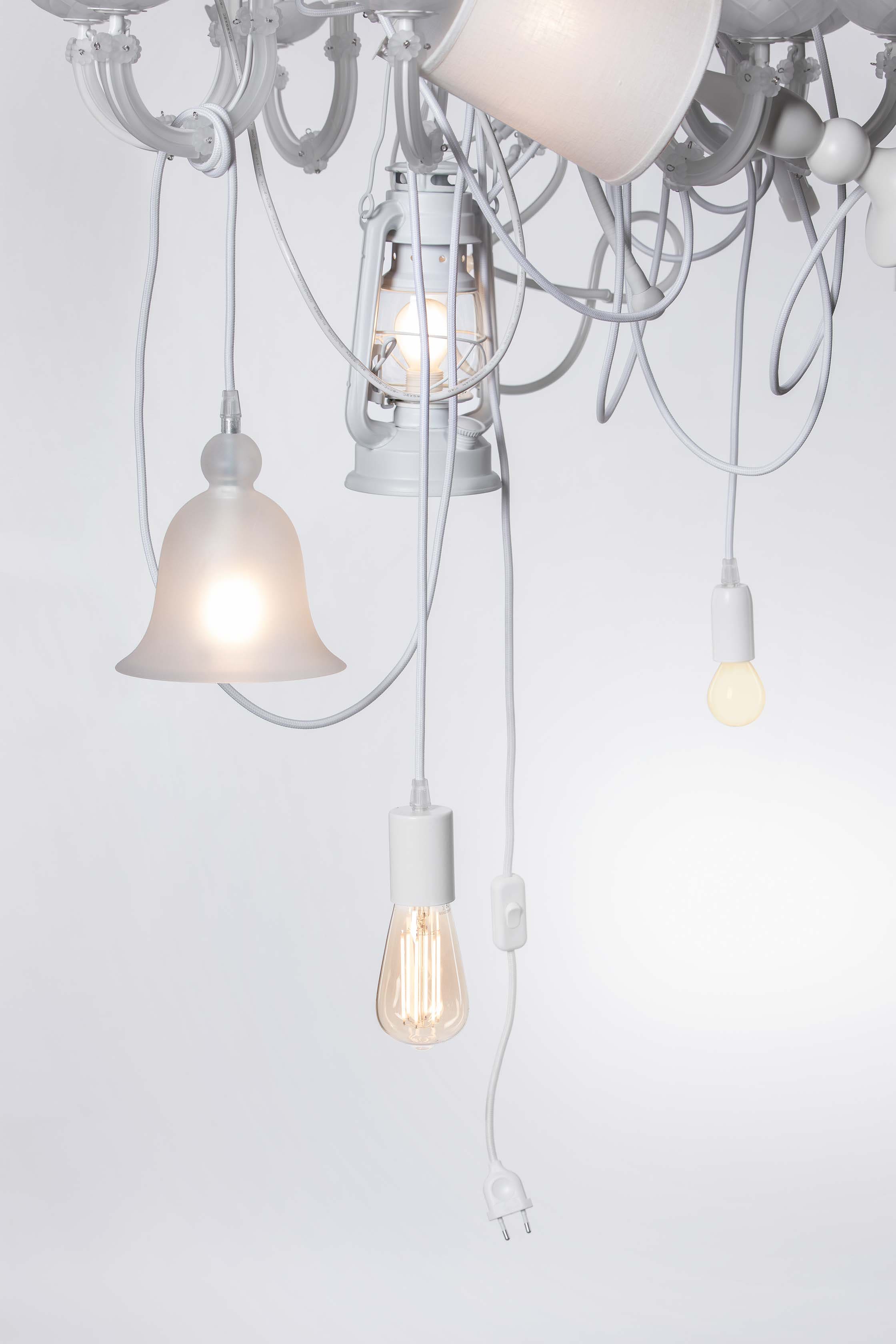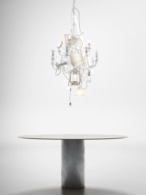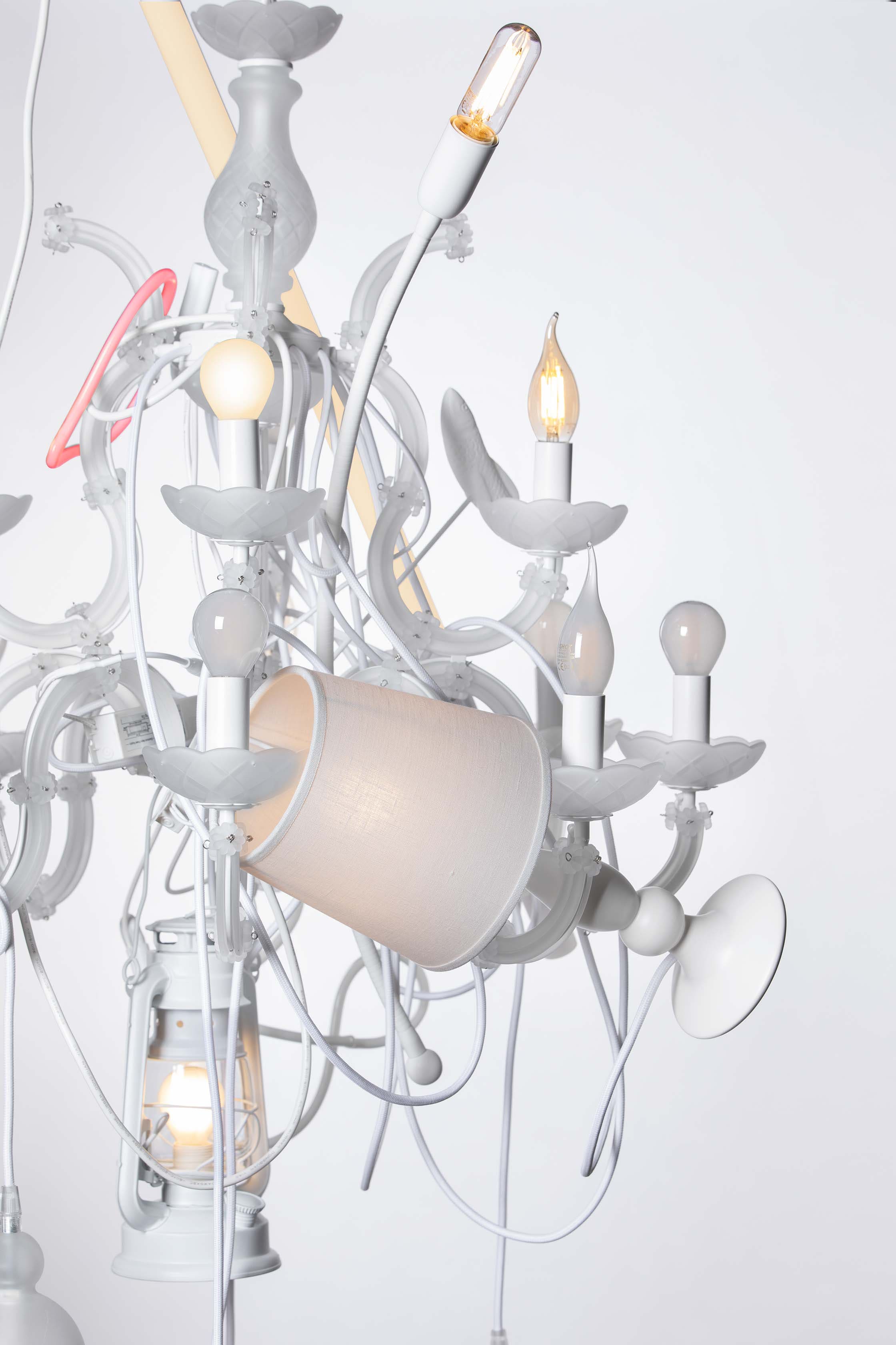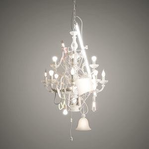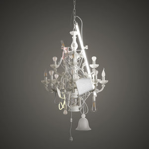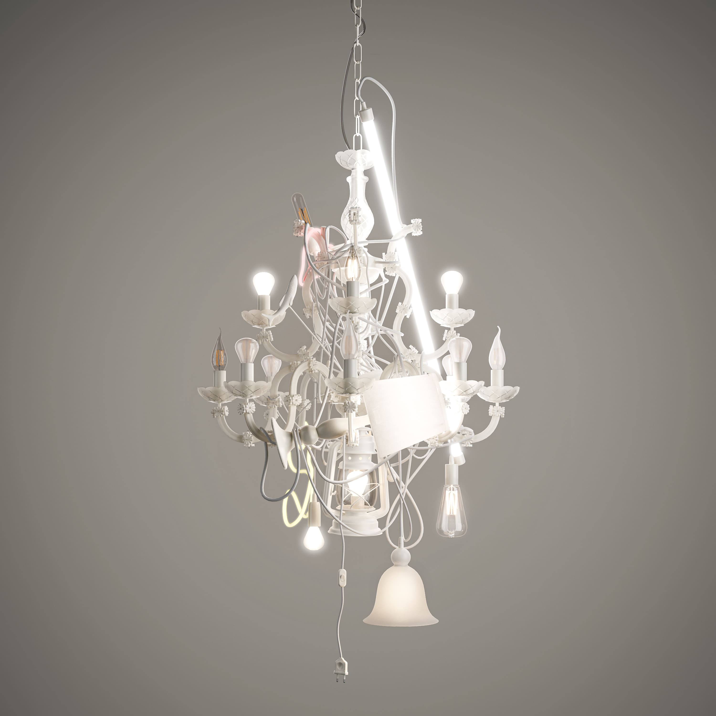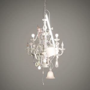 Just like the “creature”, the canonical elements are all here – a supporting structure, arms, lamps, and a cable – but Marcantonio’s irreverent borderline approach, somewhere between art and design, has brought to life a new, deconstructed silhouette, created by mixing shapes, materials, and styles, all apparently belonging to the semantic area of lighting, although from different times and places. Lots of Murano blown glass arms with a white frosted finish emerge from the central structure in white metal; the joints have rosettes and bobeches in crystal from Bohemia, stolen from the mid-18th century traditions of Venice. As ideal pendants, the designer has inserted a gas lamp, a classic bedside lamp with fabric shade, a glass bell, a lamp with a flexible arm, and even a 1980s-style neon bar. The mix also has no shortage of little “intruders” like a leaping fish in glass and a pink neon heart, providing the only note of colour.