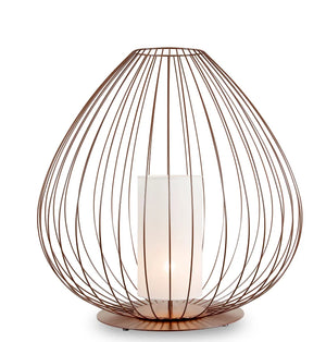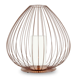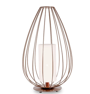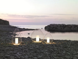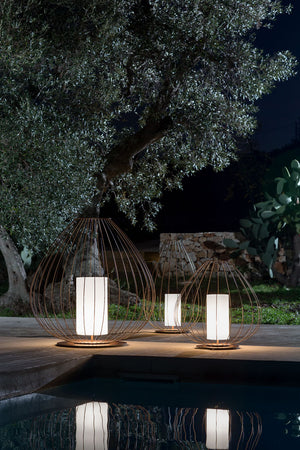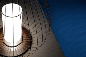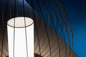 Cell emulates the structure and spirit of Chinese lanterns in the form of a pendants or floor lamps. The lampshades are made of glowing linen hearts for indoor use and opalescent plexiglass for outdoor use. The lamp is completed with a white silk tassel or, in the bronze version, a black silk tassel.