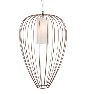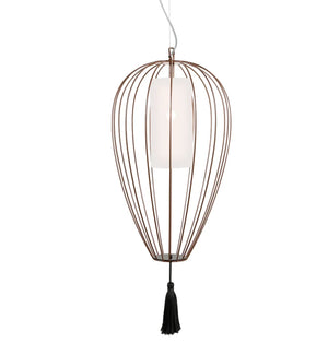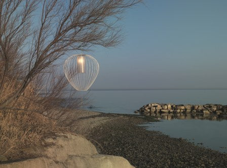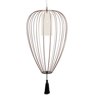 Cell emulates the structure and spirit of Chinese lanterns in the form of a pendants or floor lamps. The lampshades are made of glowing linen hearts for indoor use and opalescent plexiglass for outdoor use. The lamp is completed with a white silk tassel or, in the bronze version, a black silk tassel.