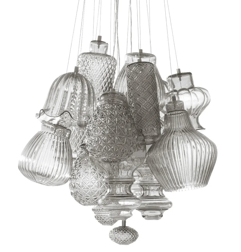 Ceraunavolta suspensions create endless color effects through the composition of many combinations that intersect with the light. Like a chorus of bells or a bouquet of spring flowers, Ceraunavolta mixes 12 different lampshades, each with its own special treatment and decoration. These lampshades are made of transparent or polished blue Tiffany glass, using the original molds from the 1970s. The chandeliers range from 12 and 17 lampshades to magnificent chandeliers with 22 elements.