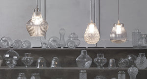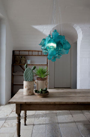 Ceraunavolta suspensions create endless color effects through the composition of many combinations that intersect with the light. Like a chorus of bells or a bouquet of spring flowers, Ceraunavolta mixes 12 different lampshades, each with its own special treatment and decoration. These lampshades are made of transparent or polished blue Tiffany glass, using the original molds from the 1970s. The chandeliers range from 12 and 17 lampshades to magnificent chandeliers with 22 elements.