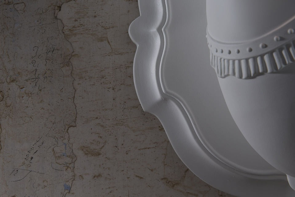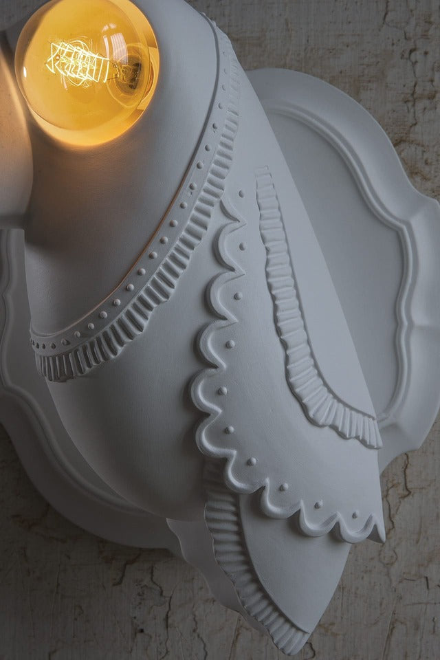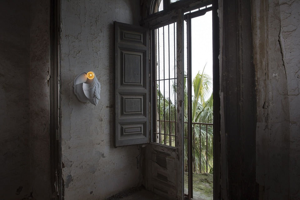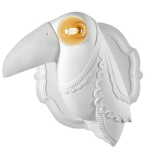 Toucan-shaped applique with huge and characteristic beak keeps an eye on us while switched on, and it is like a real piece of furniture while turned off. Made of white ceramic and has patterns of plumage that look like French lace and pastry.