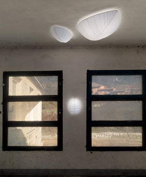 The walls are shaded by veins of foliage in three different shapes and sizes: Eden, wall lamp and ceiling lamp. The steel structure is covered with white lycra diffusers that filter and dissipate the light.