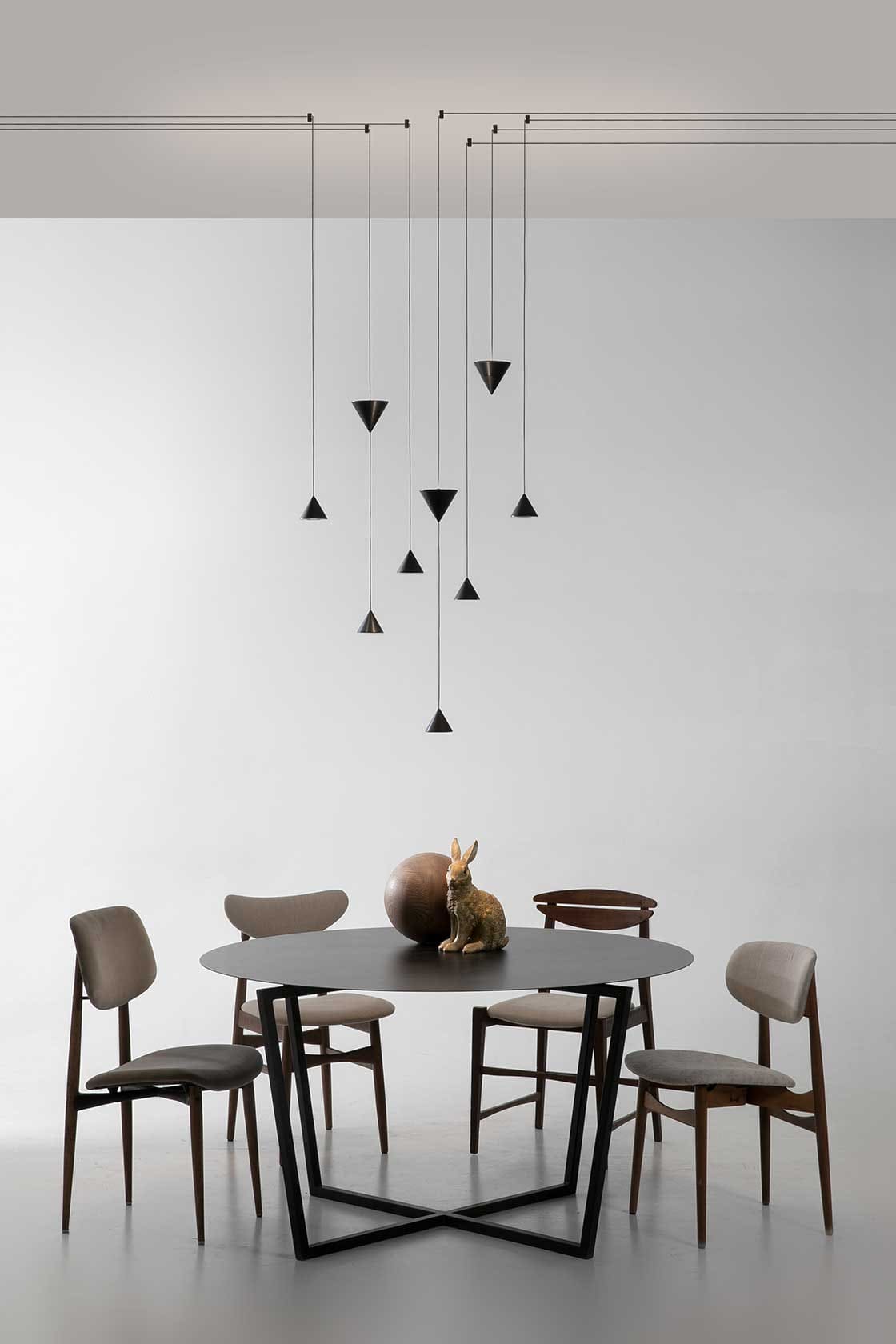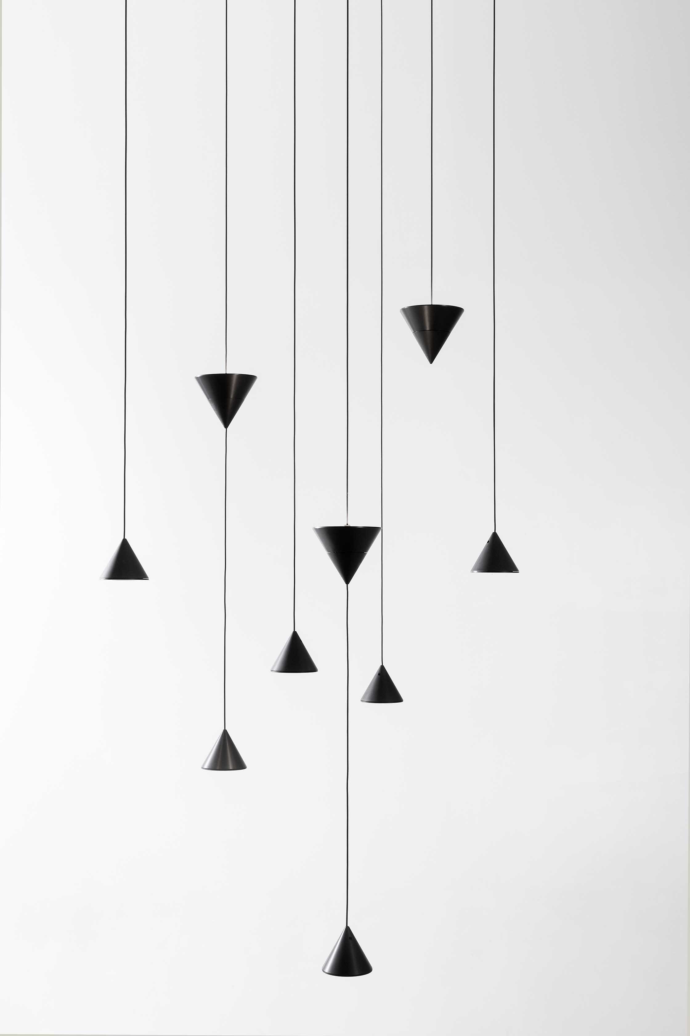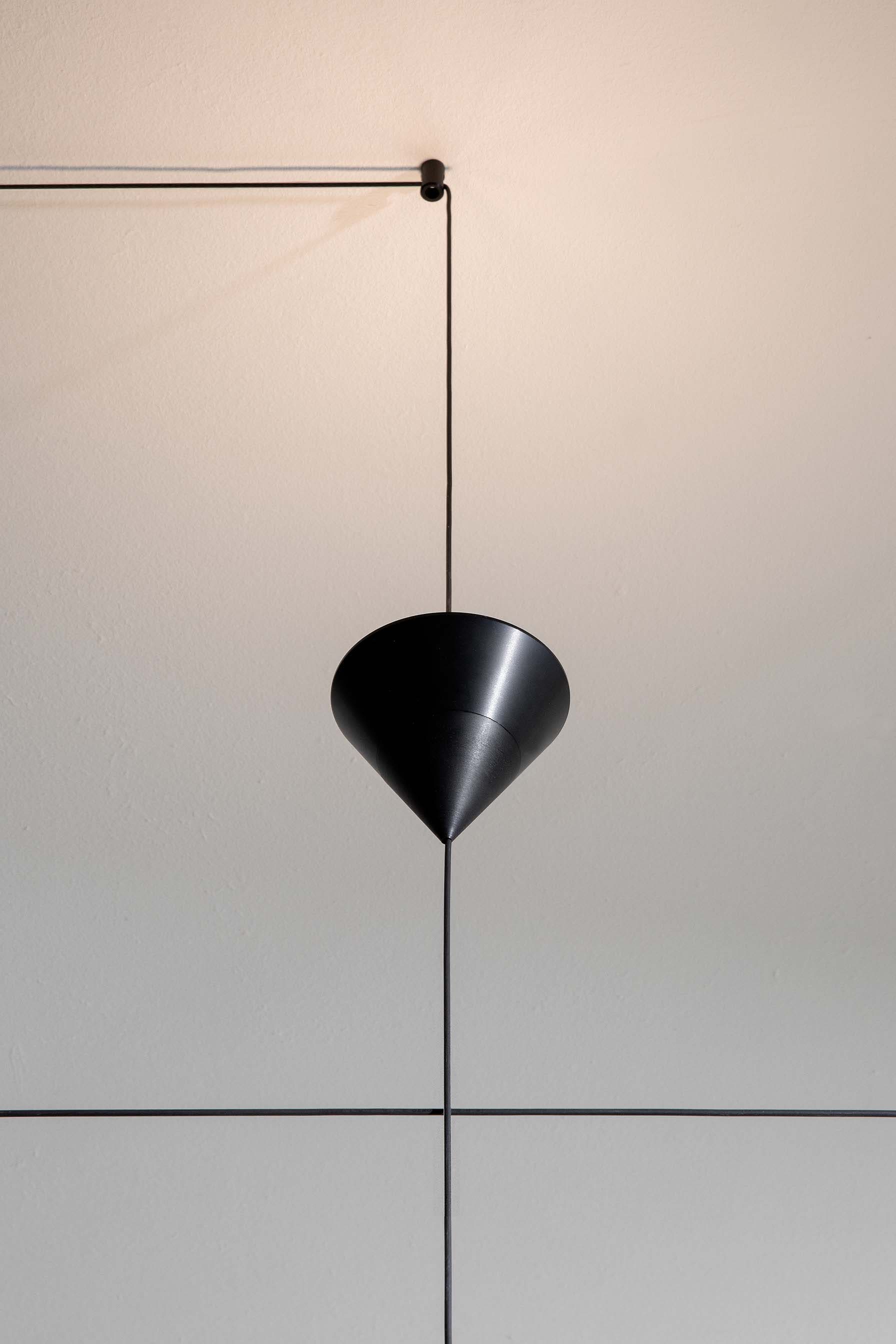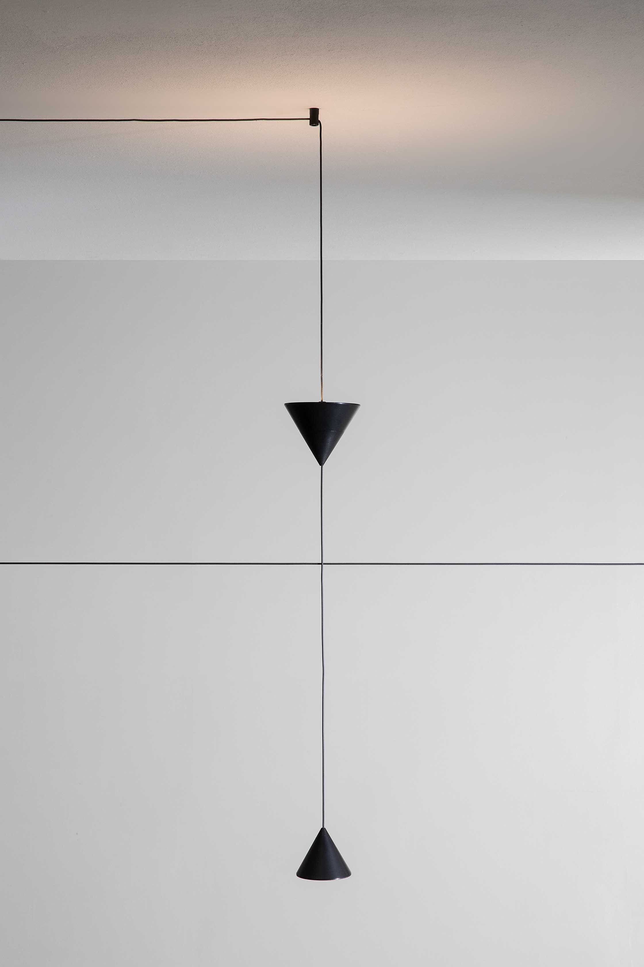 Filomena is a system of suspensions and appliques that unfolds from a simple little cone of black aluminum. The cone diffuser is the starting point for climbing ceilings and walls, and can be suspended at various heights thanks to long thin cables that allow for different refined combinations. The cable can hold even two cone bodies that diffuse the light, one smaller with the beam pointing down and the other one, larger, pointing up, distanced as needed and attached to the ceiling or wall with special black aluminum clamp. The drivers can be placed on the floor or embedded in the wall.