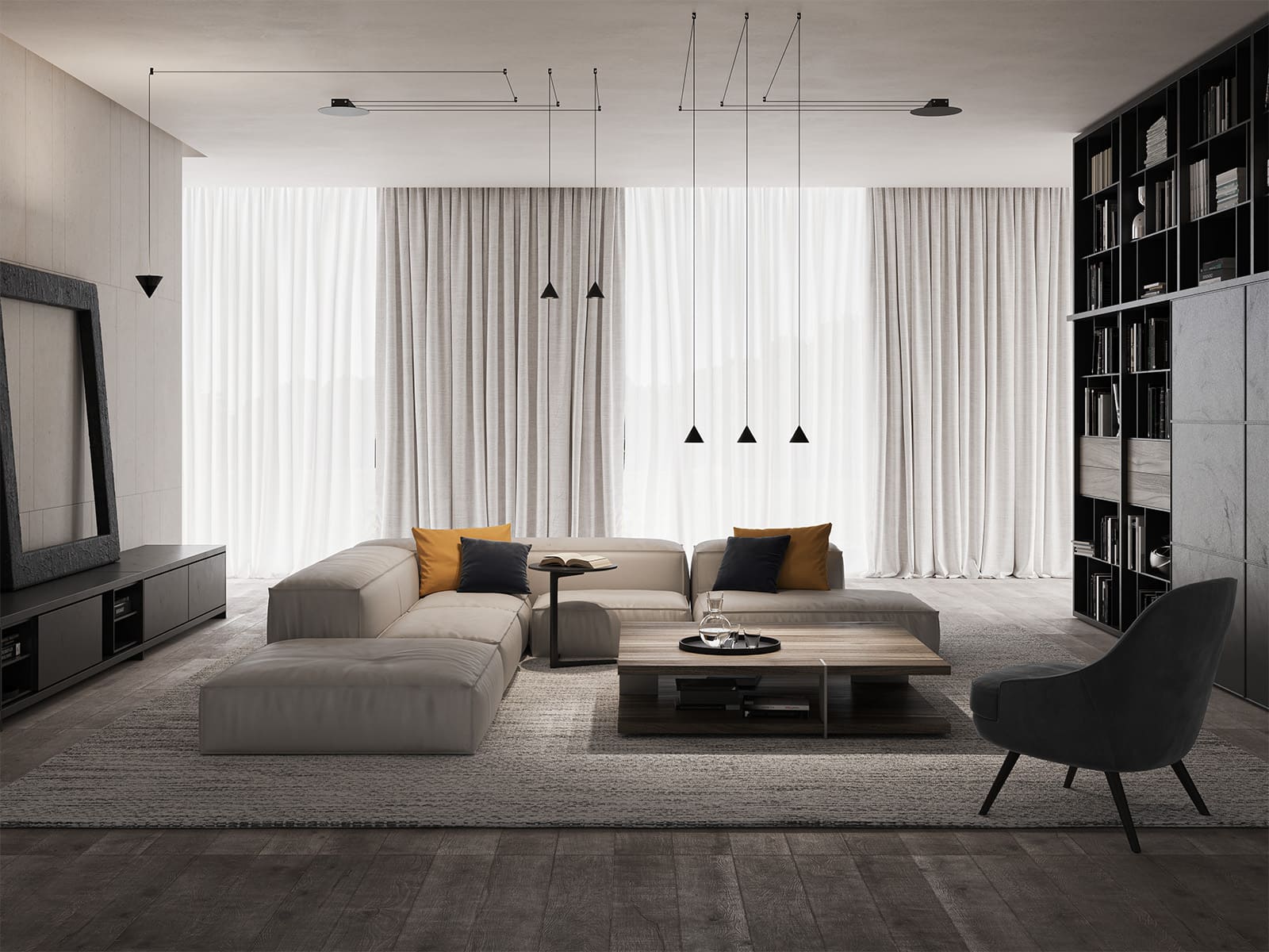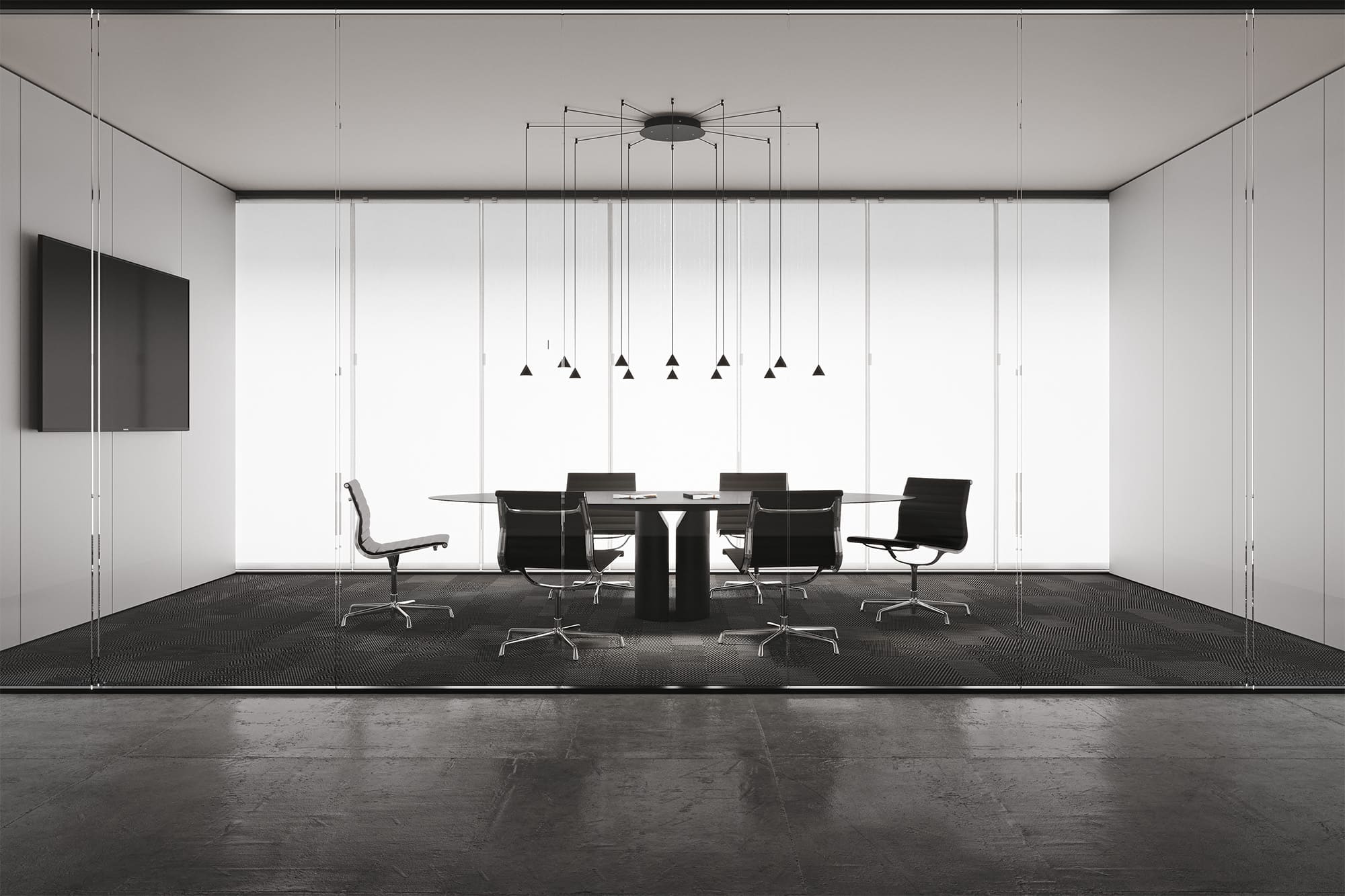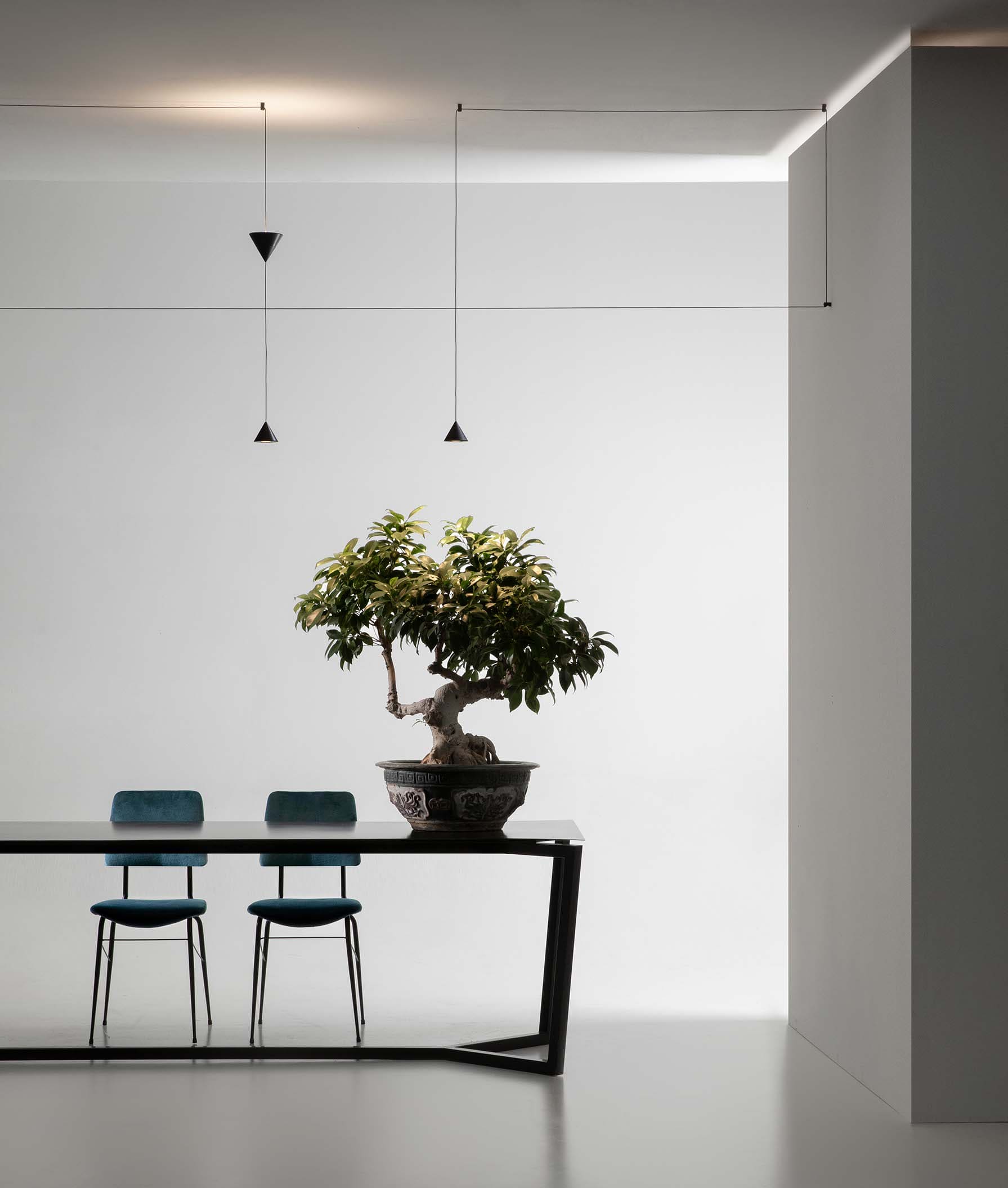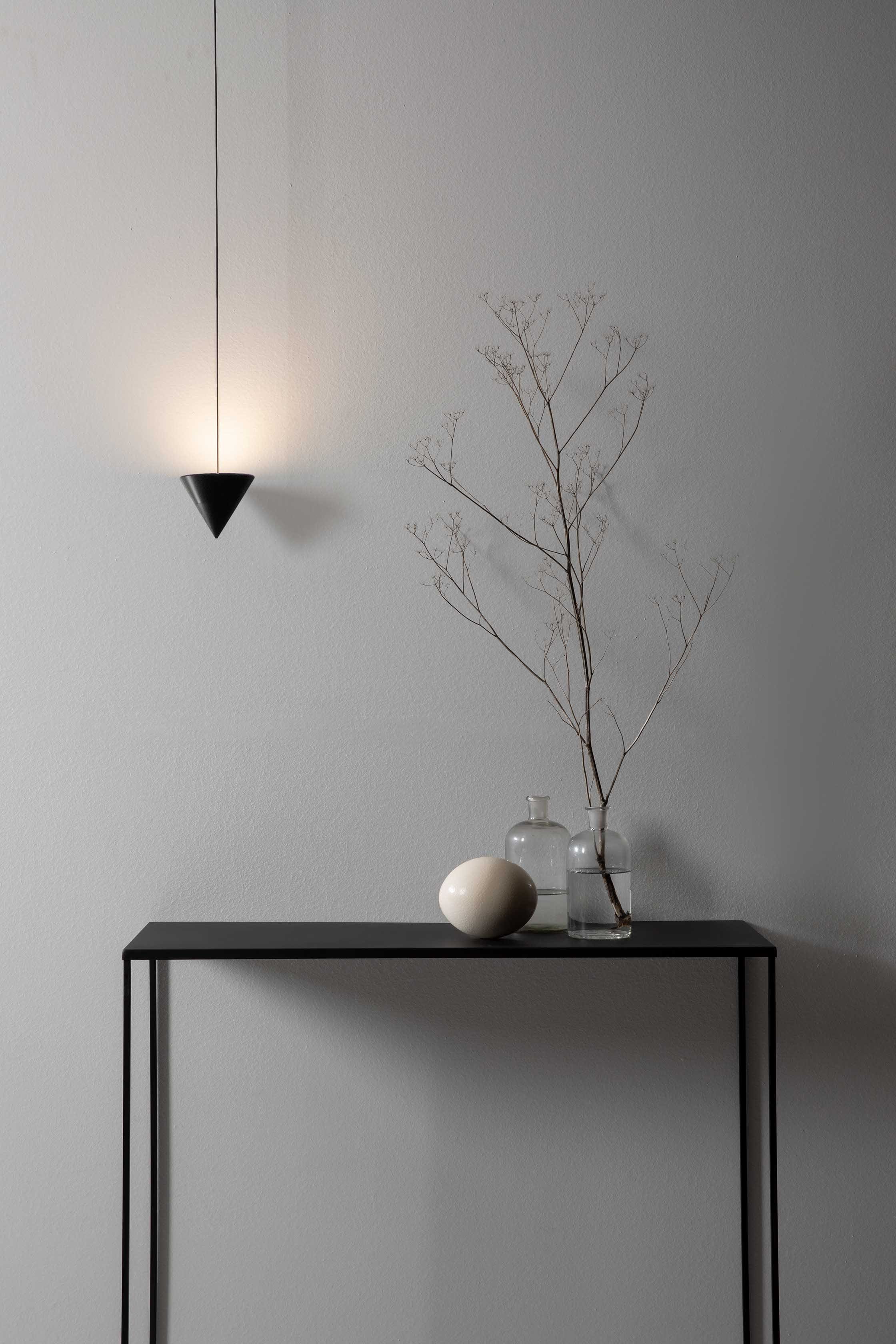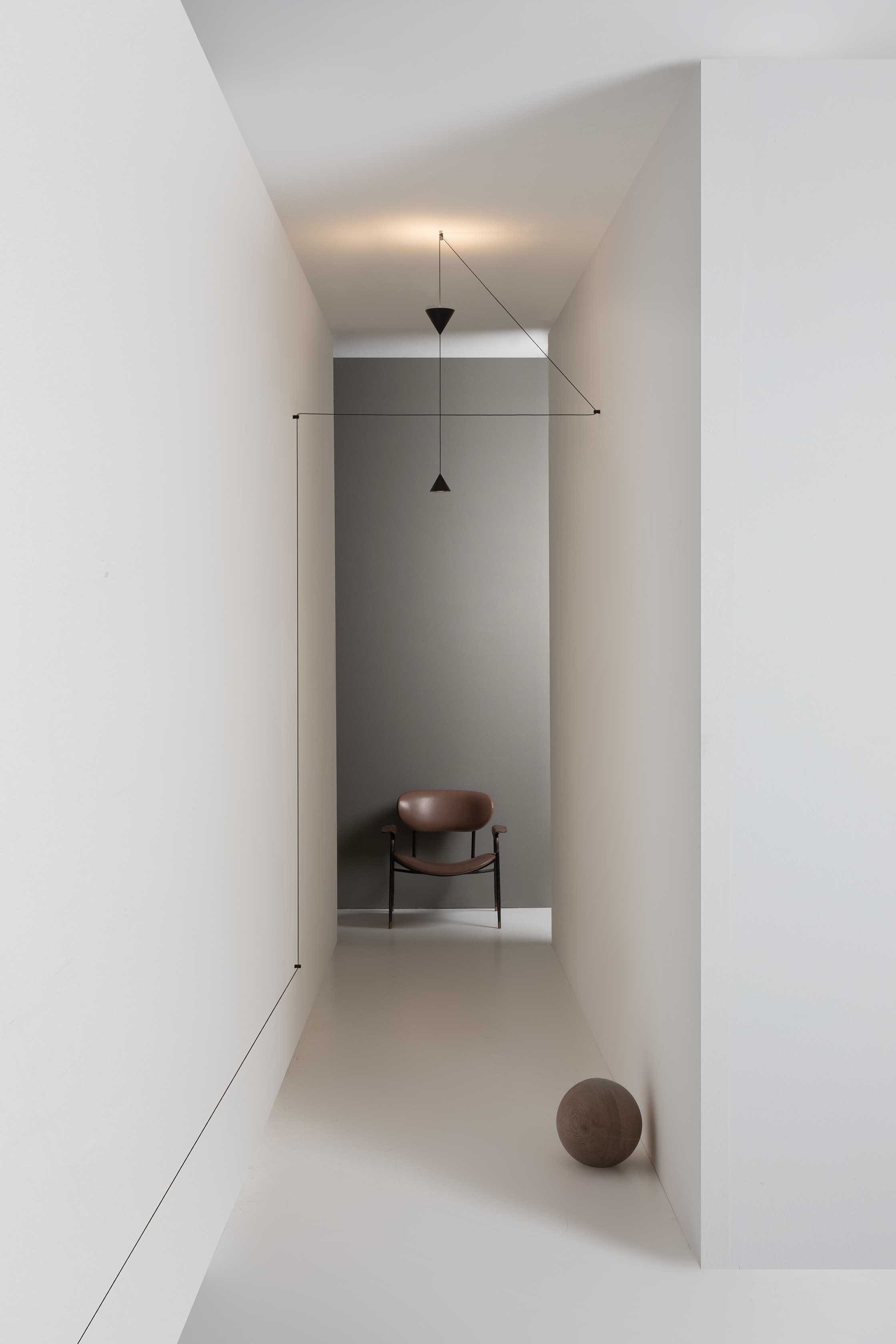 Filomena is a system of suspensions and appliques that unfolds from a simple little cone of black aluminum. The cone diffuser is the starting point for climbing ceilings and walls, and can be suspended at various heights thanks to long thin cables that allow for different refined combinations. The cable can hold even two cone bodies that diffuse the light, one smaller with the beam pointing down and the other one, larger, pointing up, distanced as needed and attached to the ceiling or wall with special black aluminum clamp. The drivers can be placed on the floor or embedded in the wall.