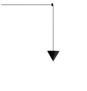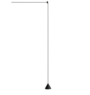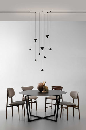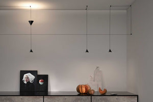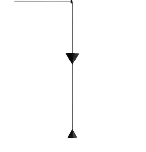Filomena is a system of suspensions and appliques that unfolds from a simple little cone of black aluminum. The cone diffuser is the starting point for climbing ceilings and walls, and can be suspended at various heights thanks to long thin cables that allow for different refined combinations. The cable can hold even two cone bodies that diffuse the light, one smaller with the beam pointing down and the other one, larger, pointing up, distanced as needed and attached to the ceiling or wall with special black aluminum clamp. The drivers can be placed on the floor or embedded in the wall.