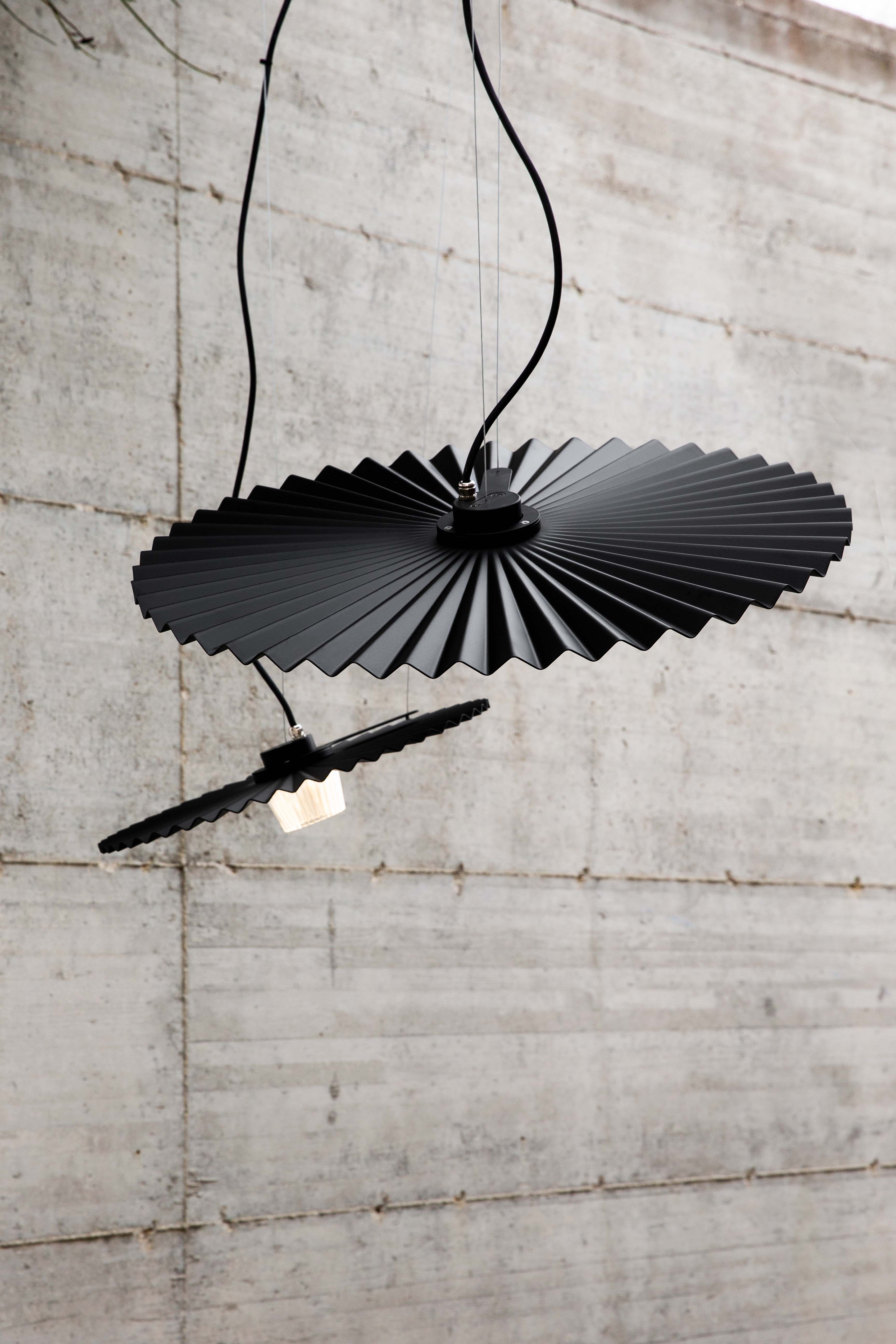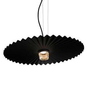 The Gonzaga suspension is inspired by rough-colored patterns and is composed of a matt aluminum, white, black and brass-finished lampshade with pleated work around a blown glass diffuser. The theatrical dynamism comes from its minimalist shape and fixed mechanism, which allows it to be freely oriented within a space. Here, light and shadow seem to chase each other endlessly. It comes in two sizes and can be used both indoors and outdoors.
