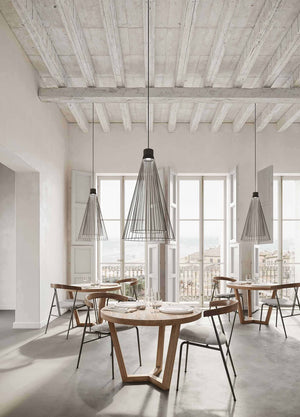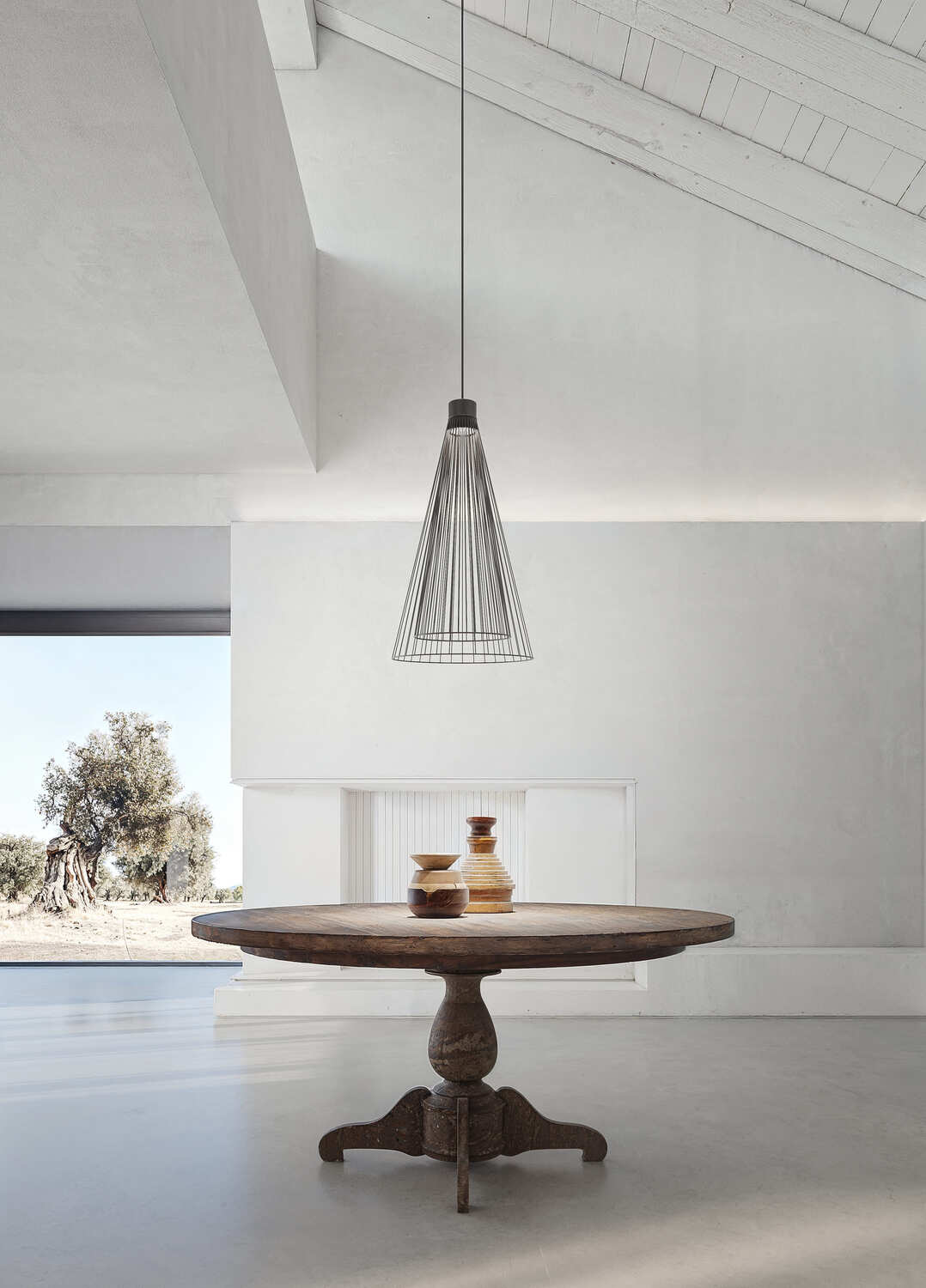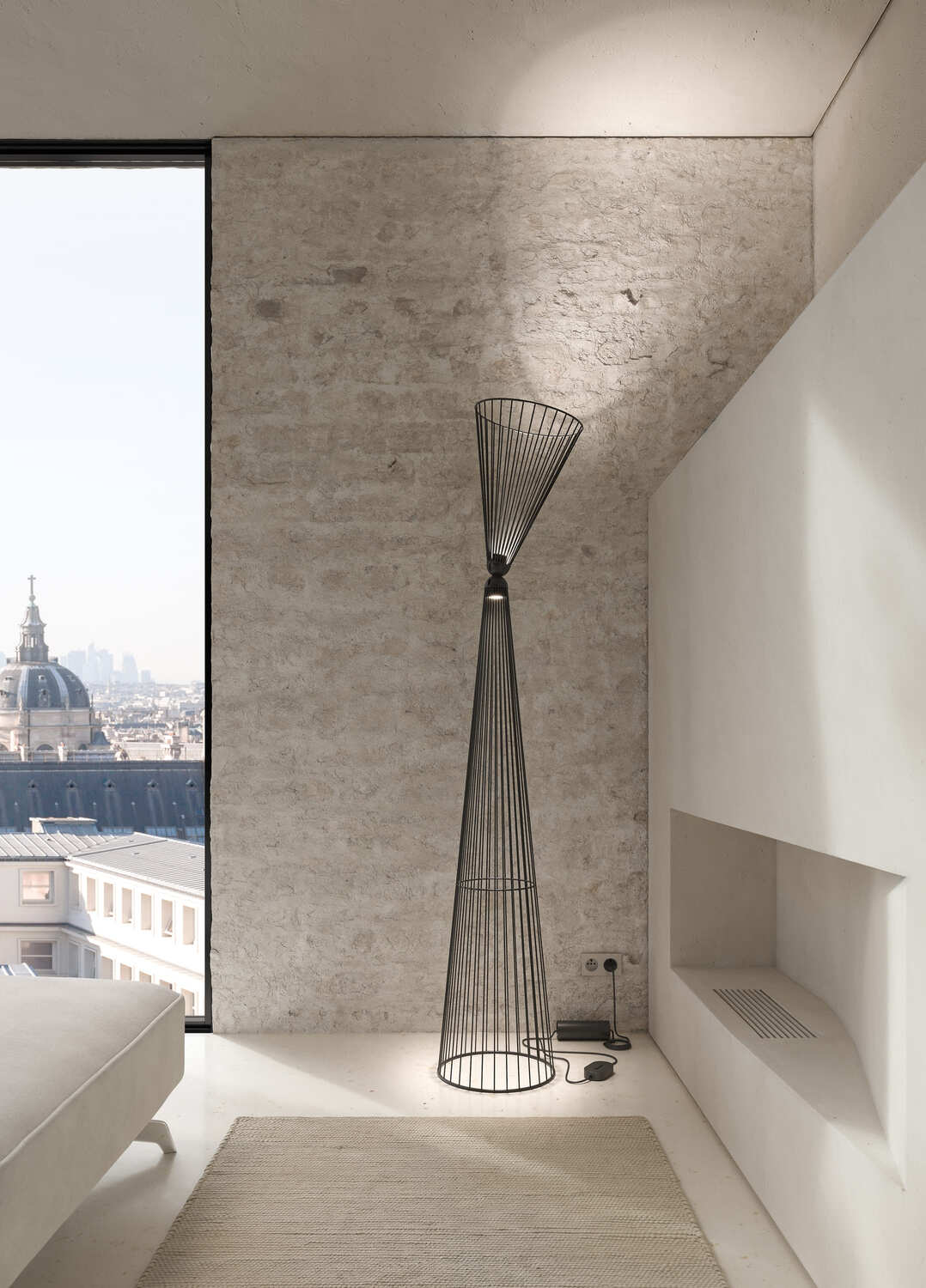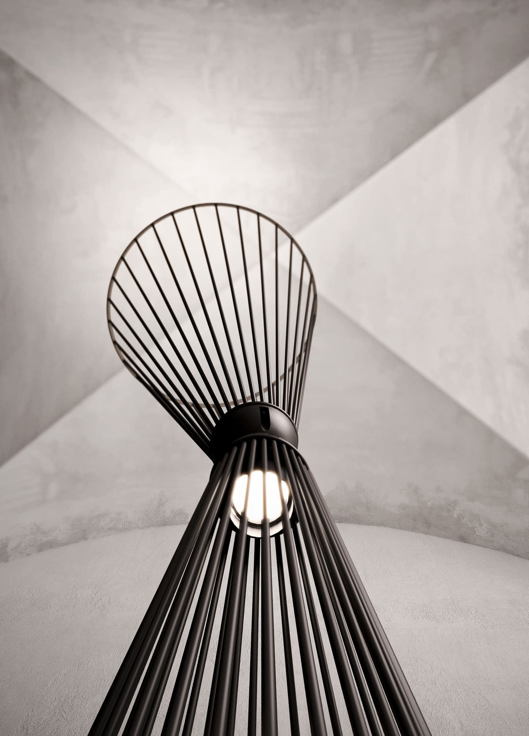 It is the ‘Collection of Crossed Destinies’: the two designers wanted to seal a long-standing creative partnership. Ikonika figuratively demonstrates how the desire to achieve composed, ultra-light ensembles can be interpreted in a manner both simple and fundamentally effective. The suspension lamp consists of a bouquet of light metal rods emanating from a single ring, then diverging to become two distinct bodies of a unified whole. Its essential and captivating metal cage structure creates an airy visual volume, capable of interacting with the surrounding environment and enhancing it through soft and diffused lighting. In the indoor version, it is perfect as a focal point above a table or in a double-height space; in the outdoor version, the floor-standing model is ideal for terraces and gardens, casting playful light and shadow patterns on the surrounding surfaces.