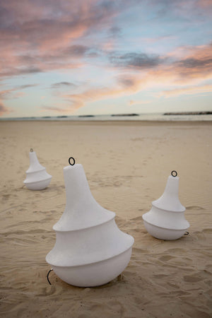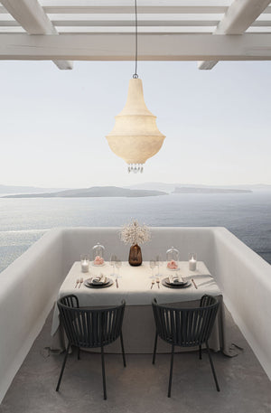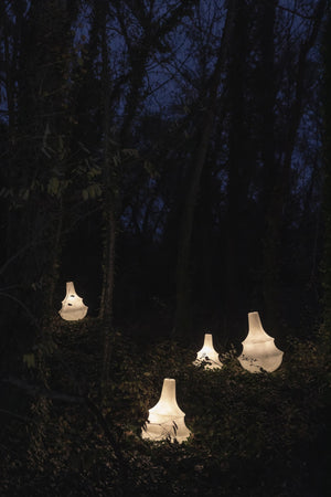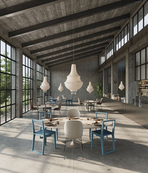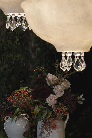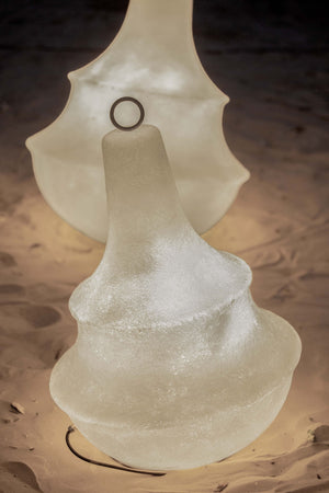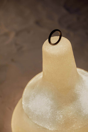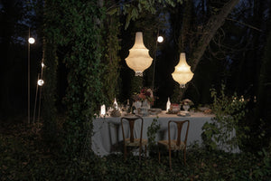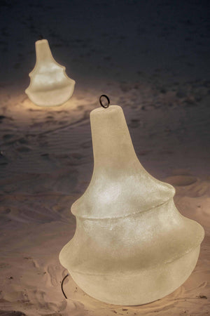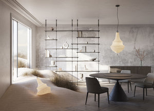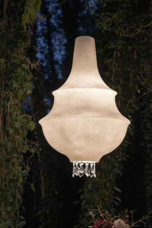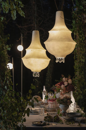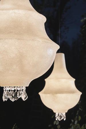Lady D retains all the elegance and class of a crystal chandelier, of high lineage but with simple and sincere demeanours. A white fiberglass diffuser enhances the silhouette of the collection, from which crystal drops hang down in the pendant version. The floor version, without the crystal drops, can be moved thanks to a ring on the top of the diffuser.