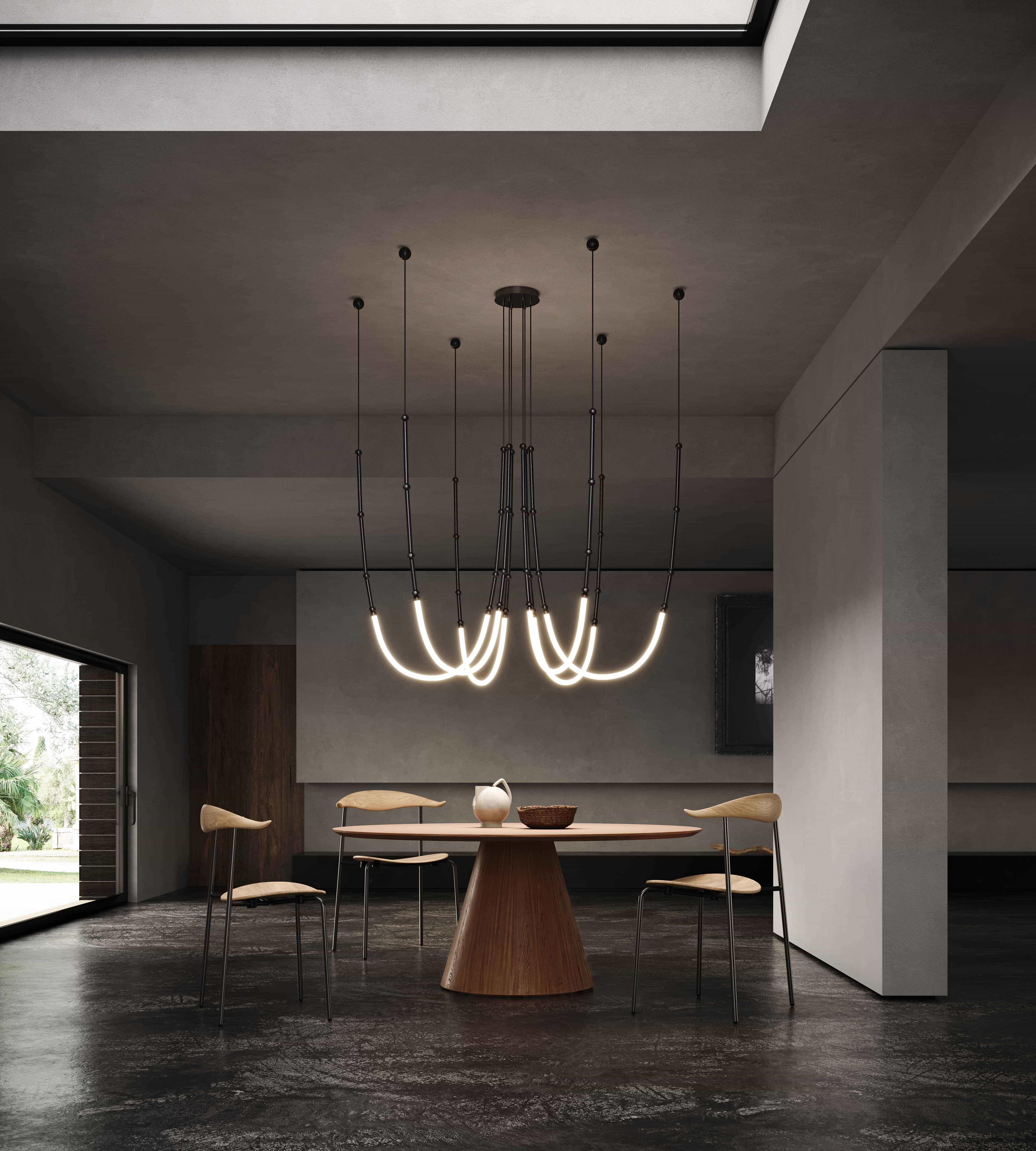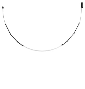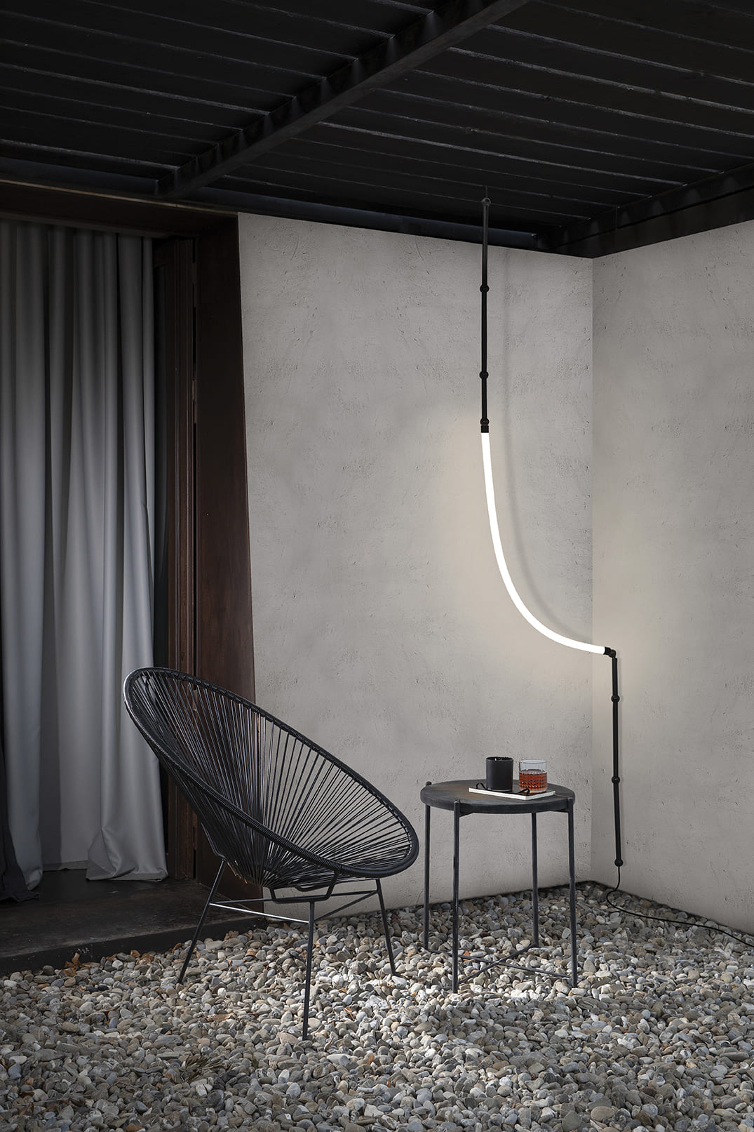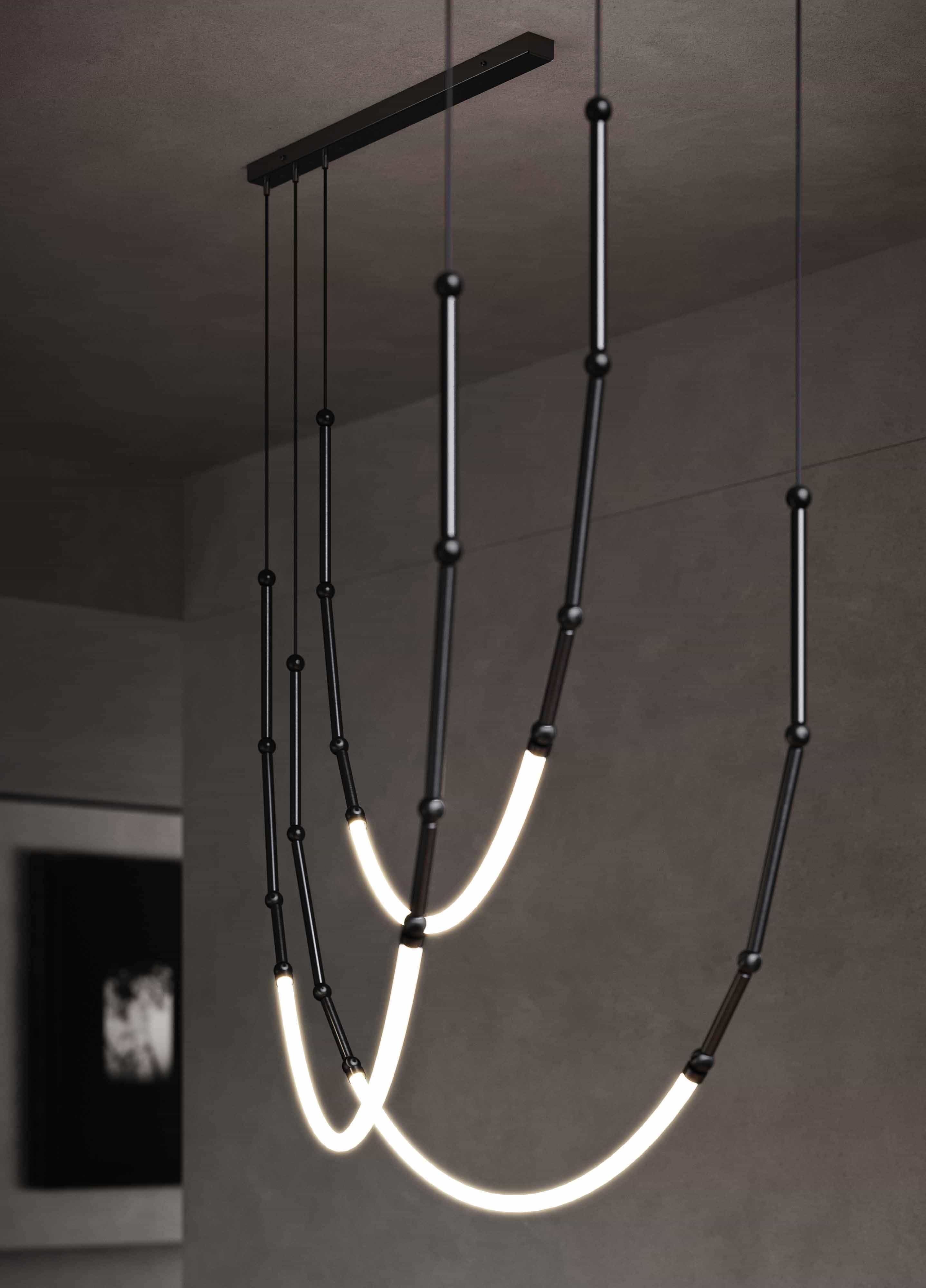 Like precious jewels adorning a woman’s neck, these modular and flexible light elements decorates the room. The lamps in this collection alternate between cylindrical bars and small spheres of anodized bronze or black aluminum, arranged like pearls in a ring on a wire supporting LEDs encased in a transparent, flexible silicone tube. Customizable to the space to be illuminated, Leda is a cohesive and decorative chain that surrounds a universal symbol and alludes to the charming idea of the circle as a symbol of elegance and beauty. Installable in any direction, Leda can be used indoors or outdoors as a suspension, floor lamp, or system lighting to decorate and illuminate elegant rooms, porches, gardens and terraces. The small metal loop also allow for flexible layout and shape changes.