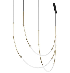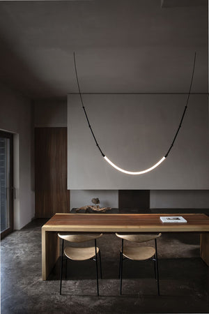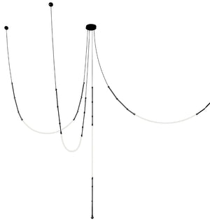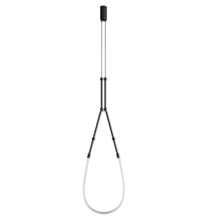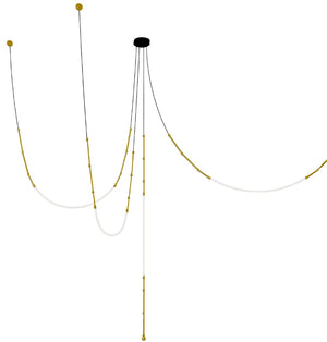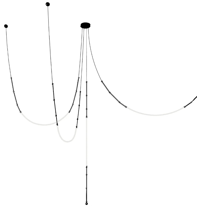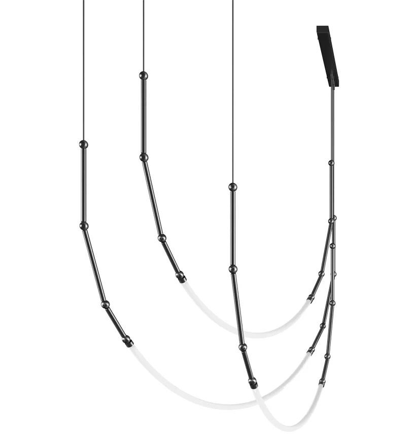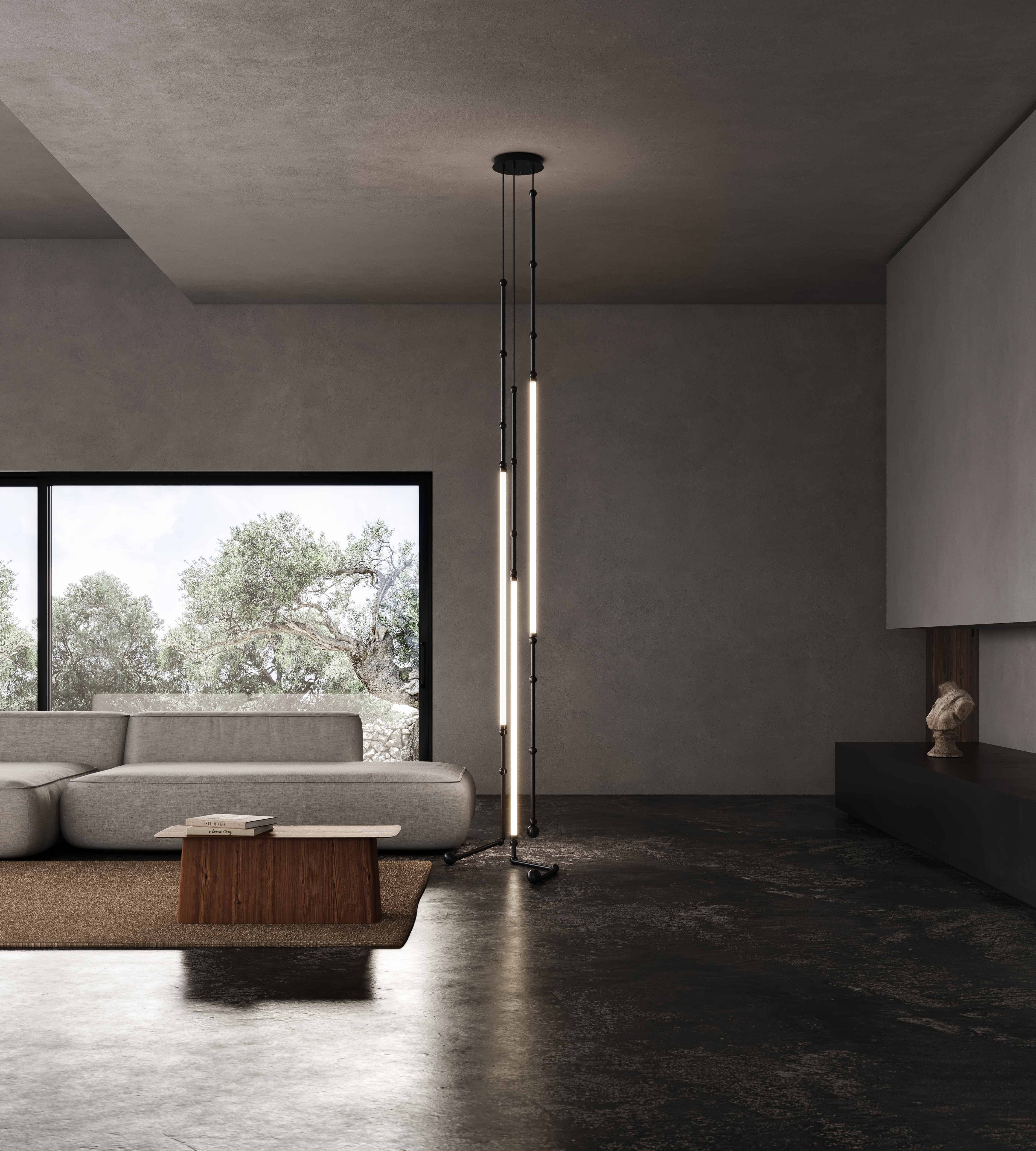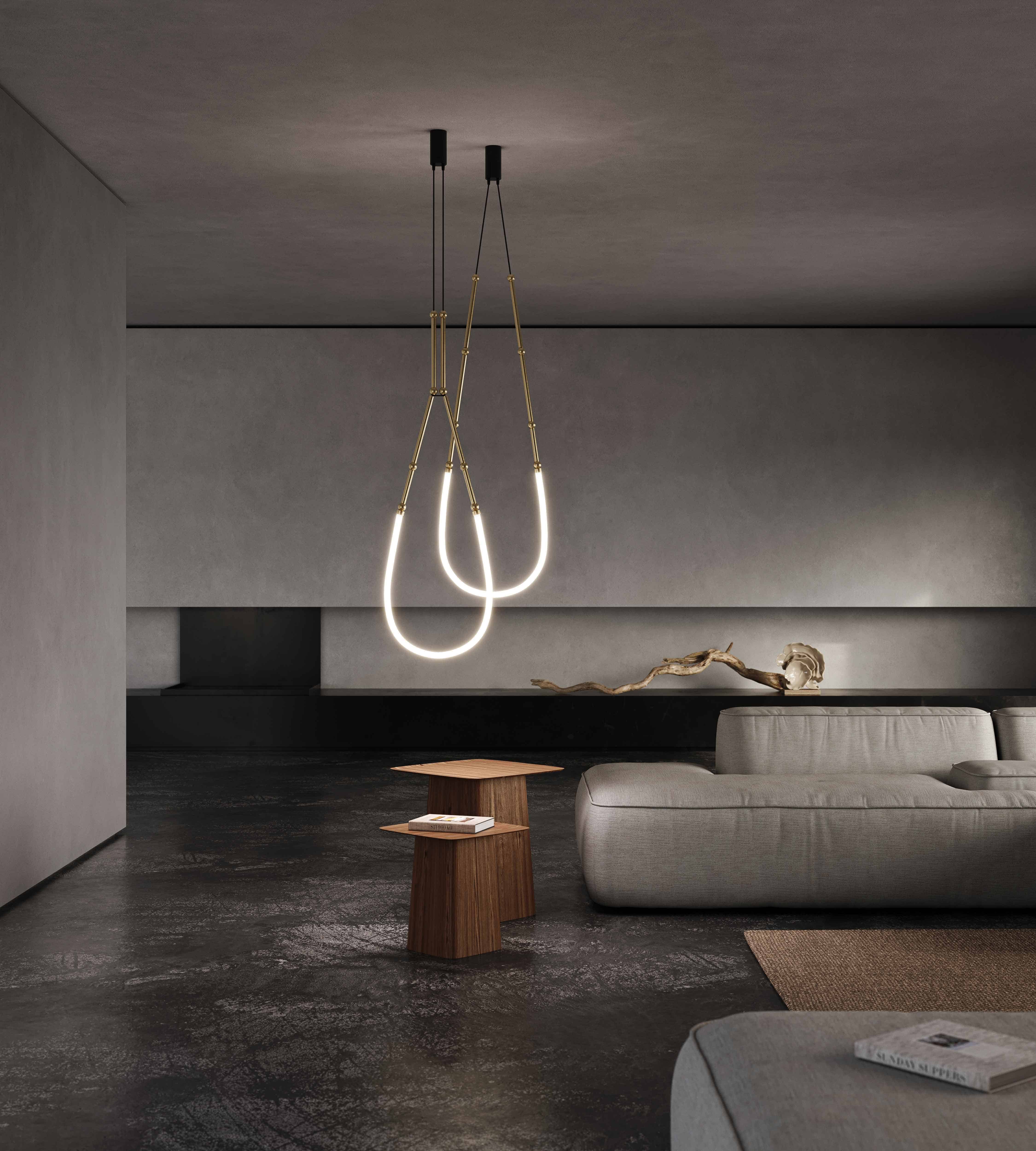 Like precious jewels adorning a woman’s neck, these modular and flexible light elements decorates the room. The lamps in this collection alternate between cylindrical bars and small spheres of anodized bronze or black aluminum, arranged like pearls in a ring on a wire supporting LEDs encased in a transparent, flexible silicone tube. Customizable to the space to be illuminated, Leda is a cohesive and decorative chain that surrounds a universal symbol and alludes to the charming idea of the circle as a symbol of elegance and beauty. Installable in any direction, Leda can be used indoors or outdoors as a suspension, floor lamp, or system lighting to decorate and illuminate elegant rooms, porches, gardens and terraces. The small metal loop also allow for flexible layout and shape changes.
