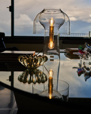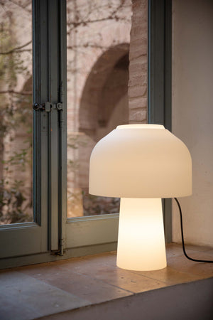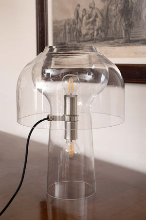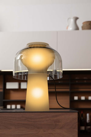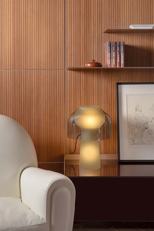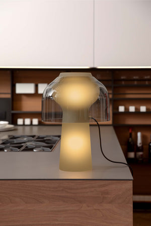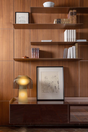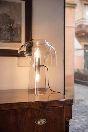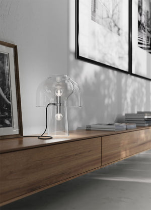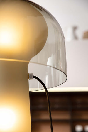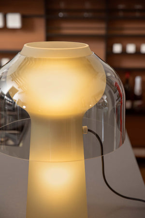 It starts with three basic versions, where the sinuously elegant table lamp designed by Giorgio Silla, although in the same curvilinear shape and with the same fragile, ethereal material, has aesthetics that are so different as to give it three different personalities: a transparent voile in blown glass, formed to show the double light fitting inside the base and shade, the total look of frosted white glass that makes it difficult to tell the difference between the base and shade, and a two-tone piece in smoked glass for the body of the lamp, and transparent glass for the diffuser. The name is a tribute to Lilly Reich, German architect and exhibition designer during the roaring Twenties of Bauhaus, known for having created, among other things, the exhibition “Glass Room” (working with Mies van der Rohe), an avant garde display with glass as its protagonist, set out in original curves and used in brand new ways.