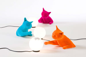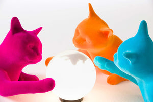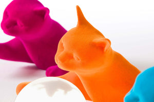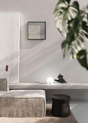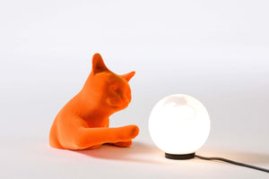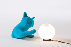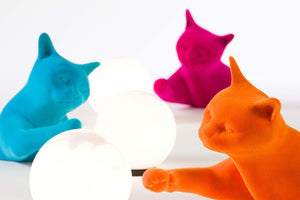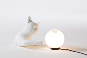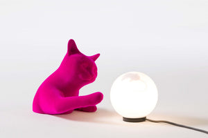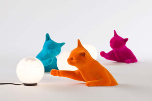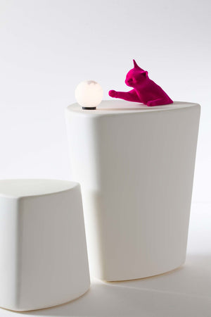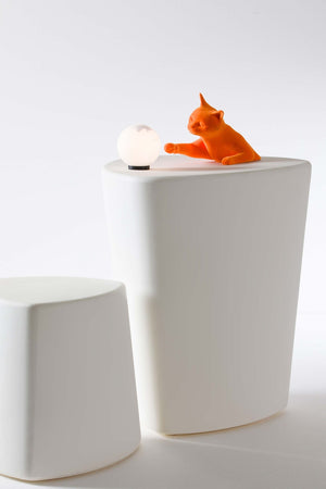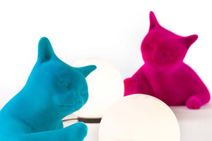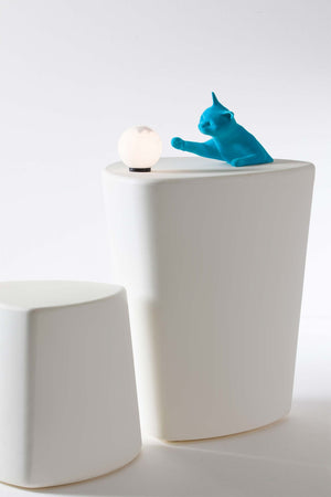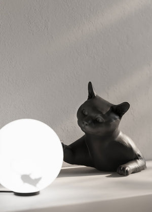 The cat appears to jump out of the wall or from the table, and playfully tease the mouse with its paws inside the luminous sphere. Composed of two elements, a cat body made of matt white ceramic and charcoal black ceramic, and a glass sphere with mouse-shaped inner sticker, MAOO can be hung on a wall or placed on a desk, bedside table, or table top. MAOO joins Karman Zoo, the famous collection of ceramic lamps designed by Matteo Ugolini and inspired by the animal world.