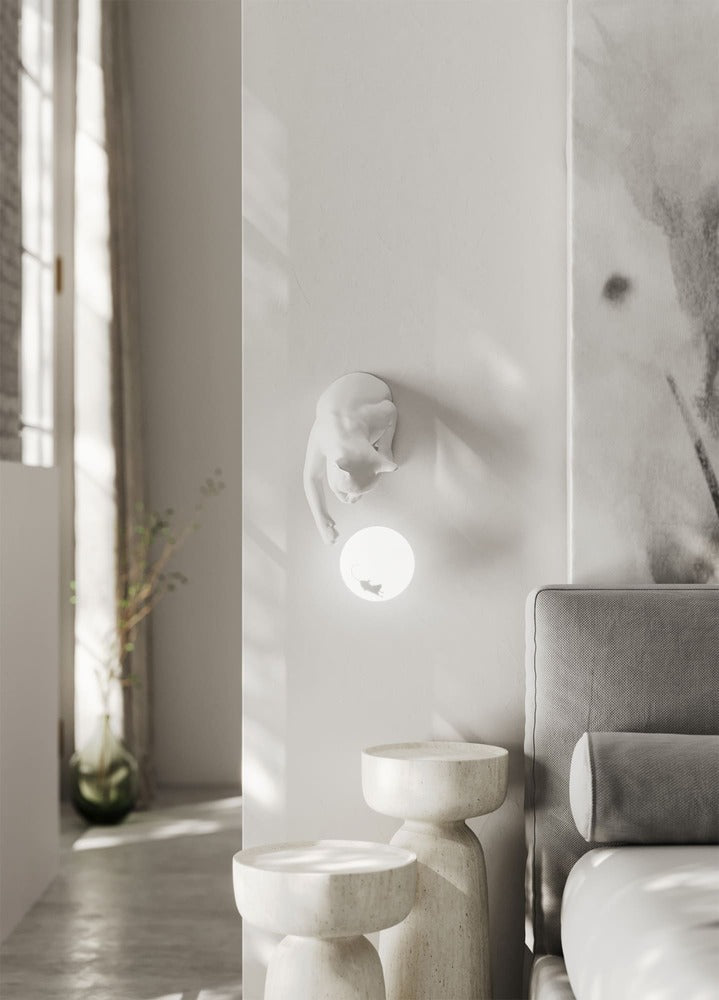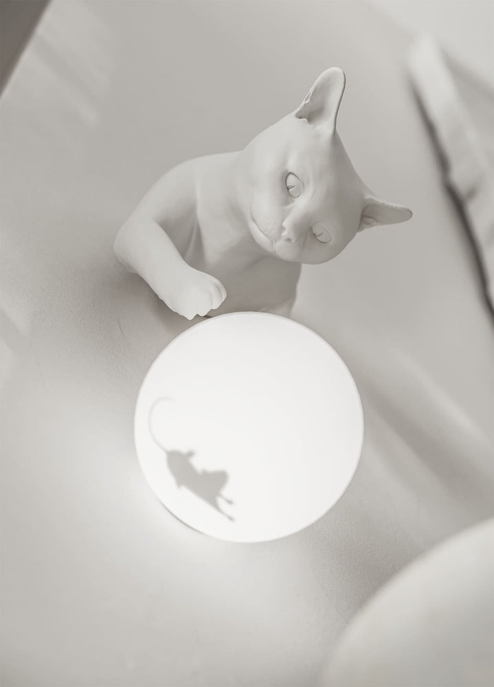 The cat appears to jump out of the wall or from the table, and playfully tease the mouse with its paws inside the luminous sphere. Composed of two elements, a cat body made of matt white ceramic and charcoal black ceramic, and a glass sphere with mouse-shaped inner sticker, MAOO can be hung on a wall or placed on a desk, bedside table, or table top. MAOO joins Karman Zoo, the famous collection of ceramic lamps designed by Matteo Ugolini and inspired by the animal world.