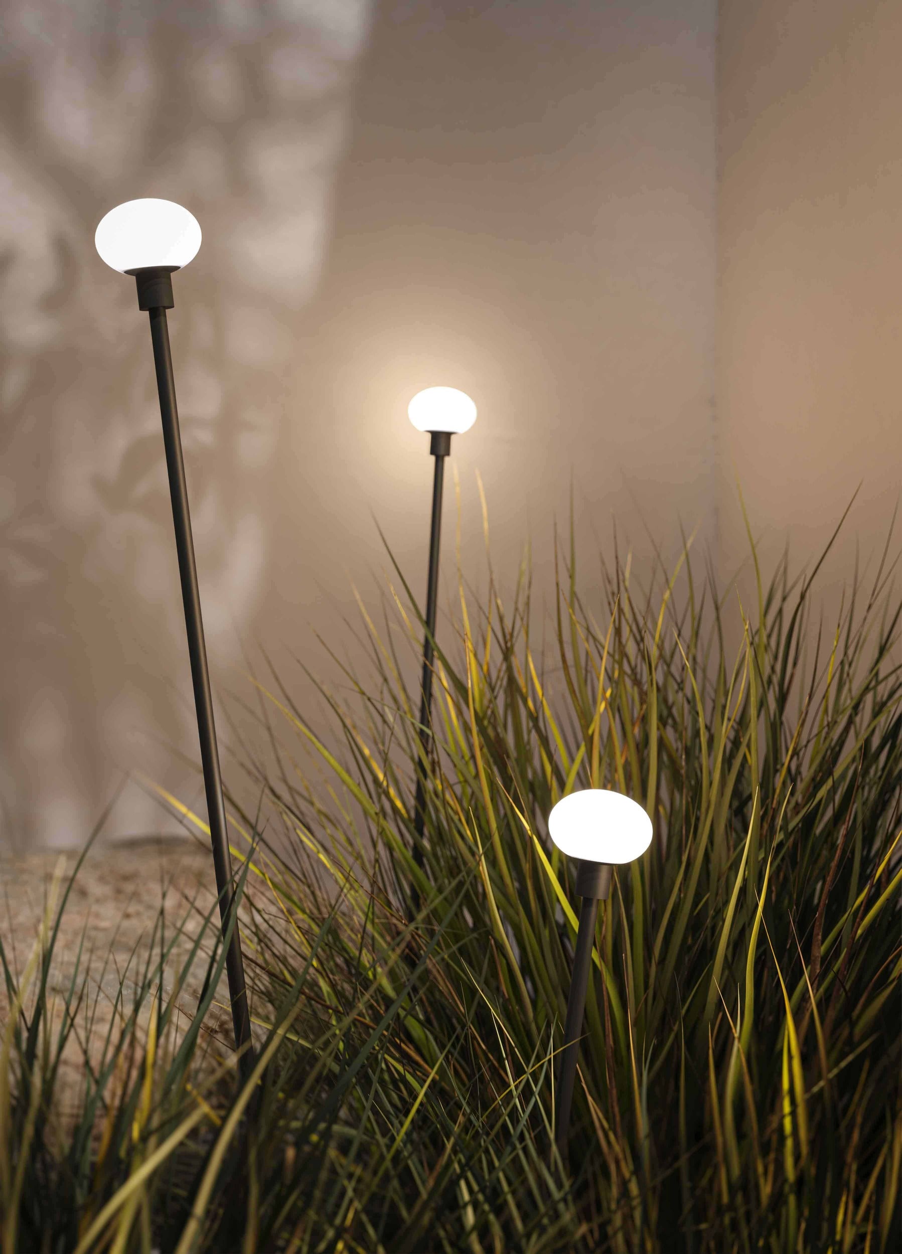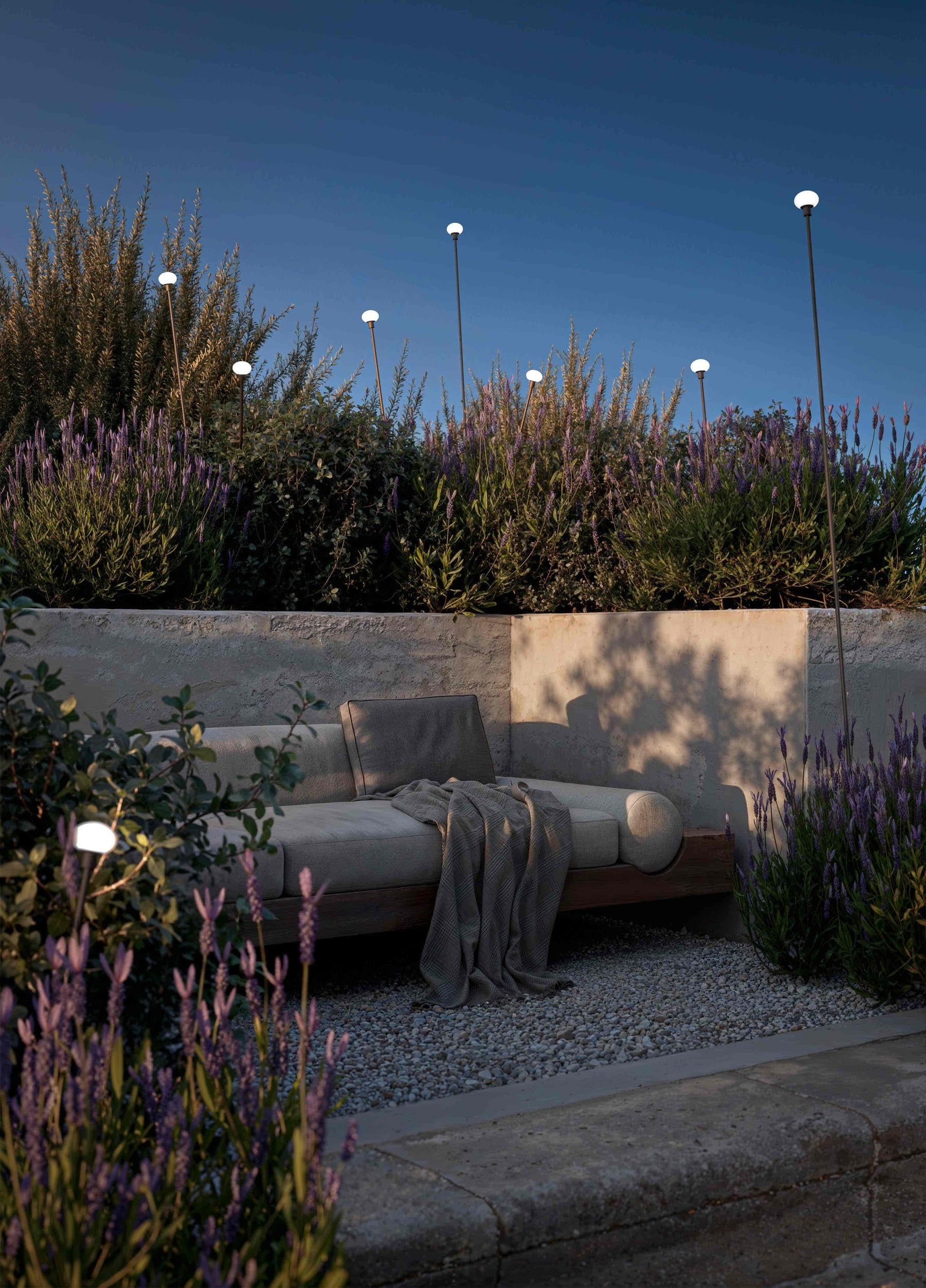 Minuit evokes a field of slender, elongated stems, ending in delicate luminous points like small suspended globes. Inspired by the natural simplicity of wildflowers, it provides a soft, diffused light, perfect for creating enchanting atmospheres in gardens, courtyards, or terraces. Its essential and contemporary structure blends seamlessly into minimalist or natural settings, enhancing the beauty of the landscape. It can be installed either with a ground spike or a fixed base.