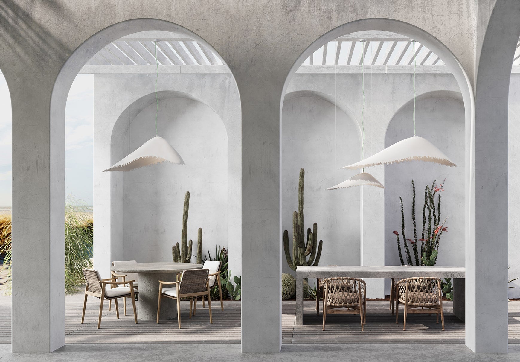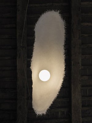 Light filters through the white fiberglass of Moby Dick, a sculptural suspension with curved lines that look like a whale. The fine play of light and shadow makes it suitable for minimalist or more decorative environments, as well as for all types of outdoor spaces. The suspension is available in two sizes, for indoor and outdoor use.