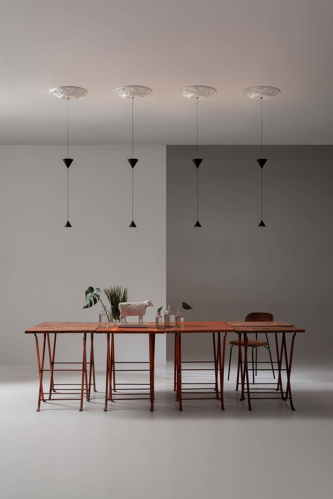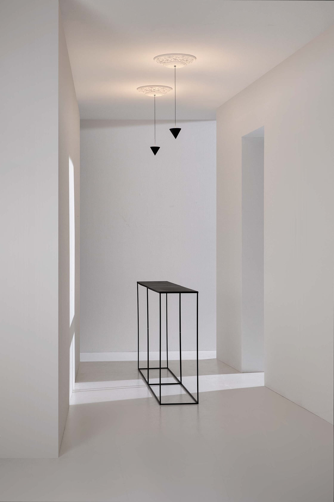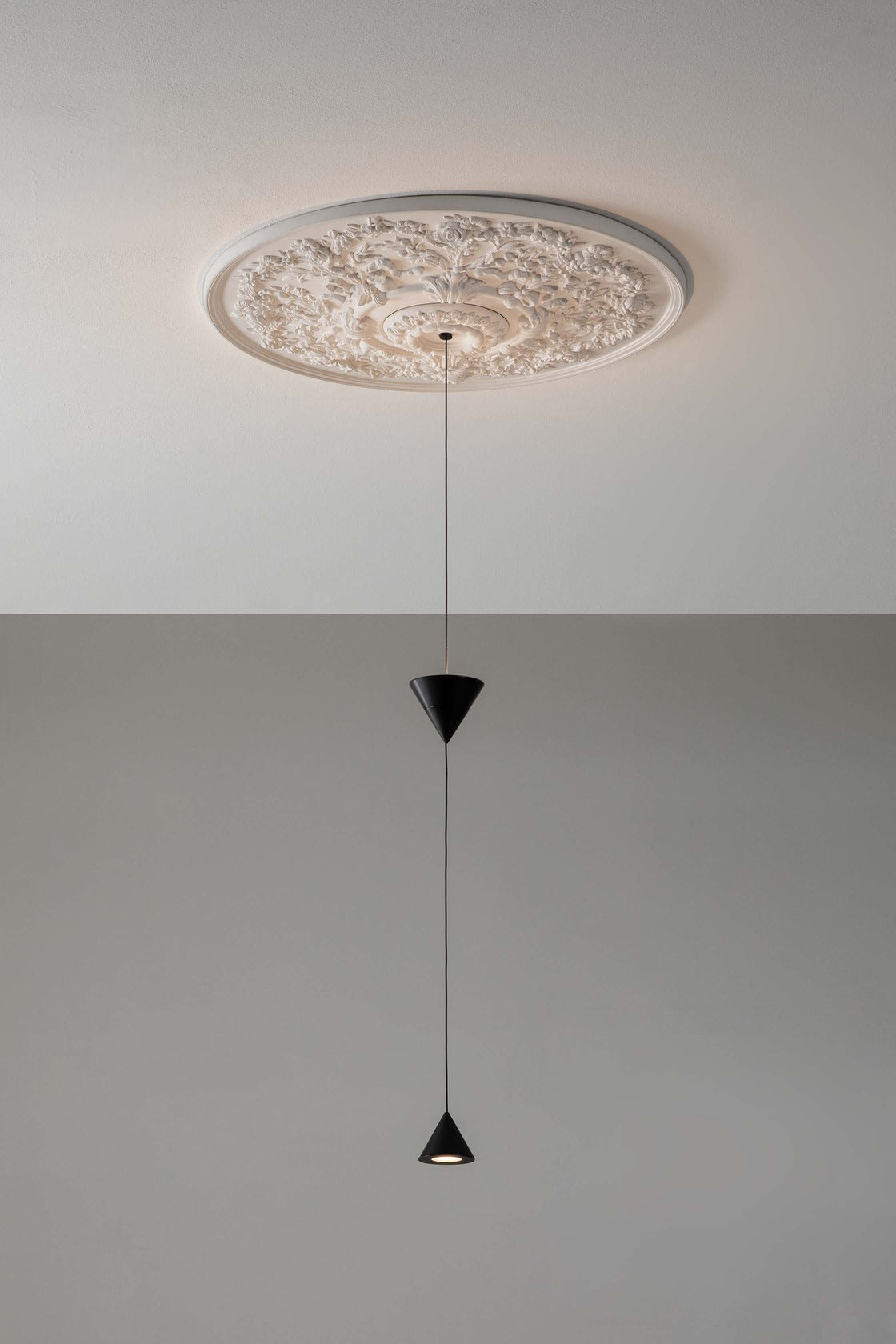 A thin black cable hangs from a large baroque rose window with a floral motif in white plaster, connected to one or two black aluminum cones at the end of the cable. The combination of this element and the classical motif of the ceiling cup makes Moonbloom a discreet architectural suspension. The rose window, available in two sizes, can be painted, immediately changing its expressiveness with a simple gesture.