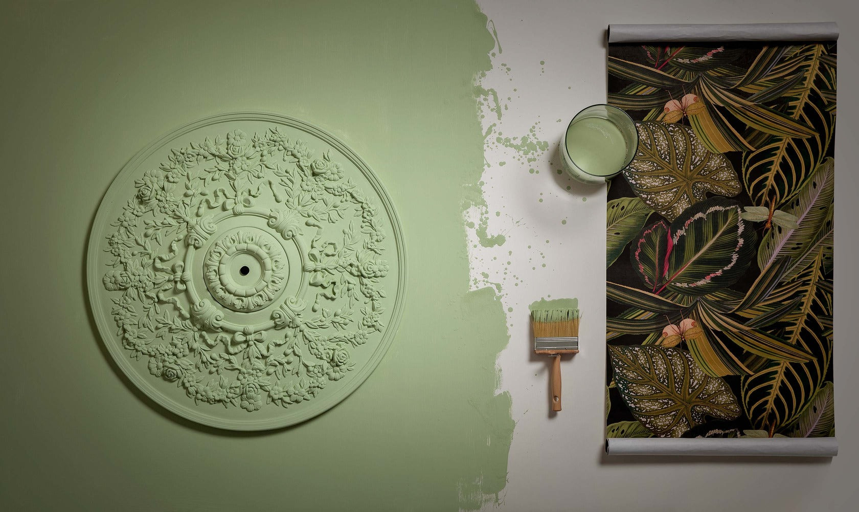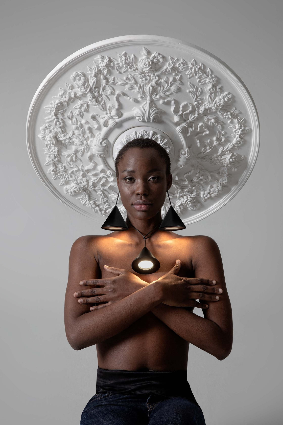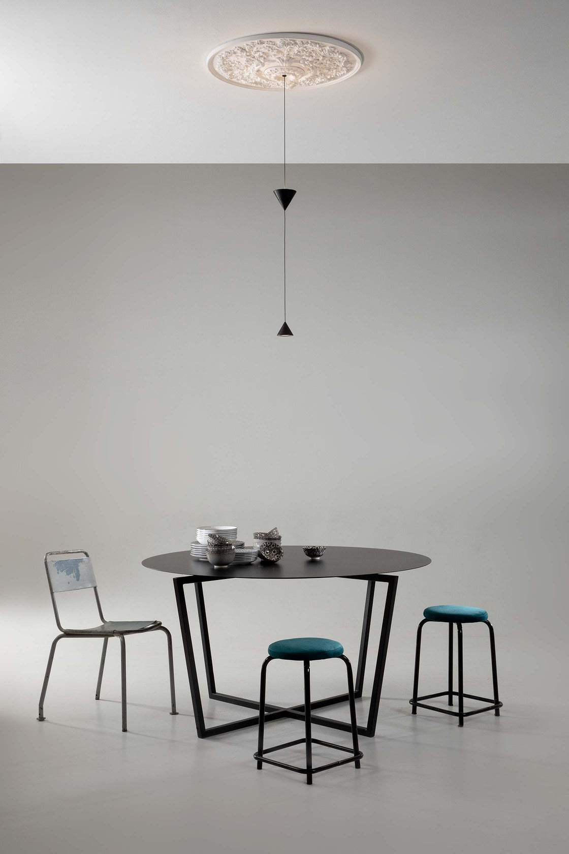 A thin black cable hangs from a large baroque rose window with a floral motif in white plaster, connected to one or two black aluminum cones at the end of the cable. The combination of this element and the classical motif of the ceiling cup makes Moonbloom a discreet architectural suspension. The rose window, available in two sizes, can be painted, immediately changing its expressiveness with a simple gesture.