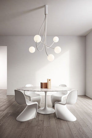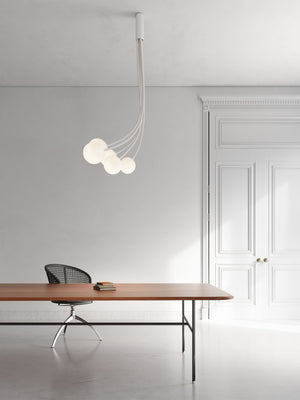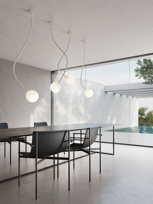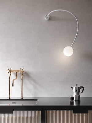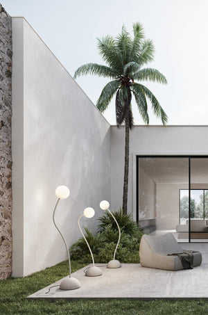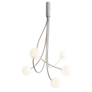 Moony by Marcantonio shows its best side by adapting to moods, thanks to its flexible arm. A versatile family, set out in single-arm applique fittings, a free-standing lamp in two heights, and a down light with single, three or even five arms to suit more complex personalities. The floor version faces upwards to the ceiling or is bent on itself, like a reading lamp. The applique version can be directed as needed, with the three- or five-arm fittings that are freed from a small cylinder secured to the ceiling, or any way your creativity can offer. The mobile rod in metal, with a white covering supports a frosted glass globe containing the LED light source. Also available in the outdoor version.