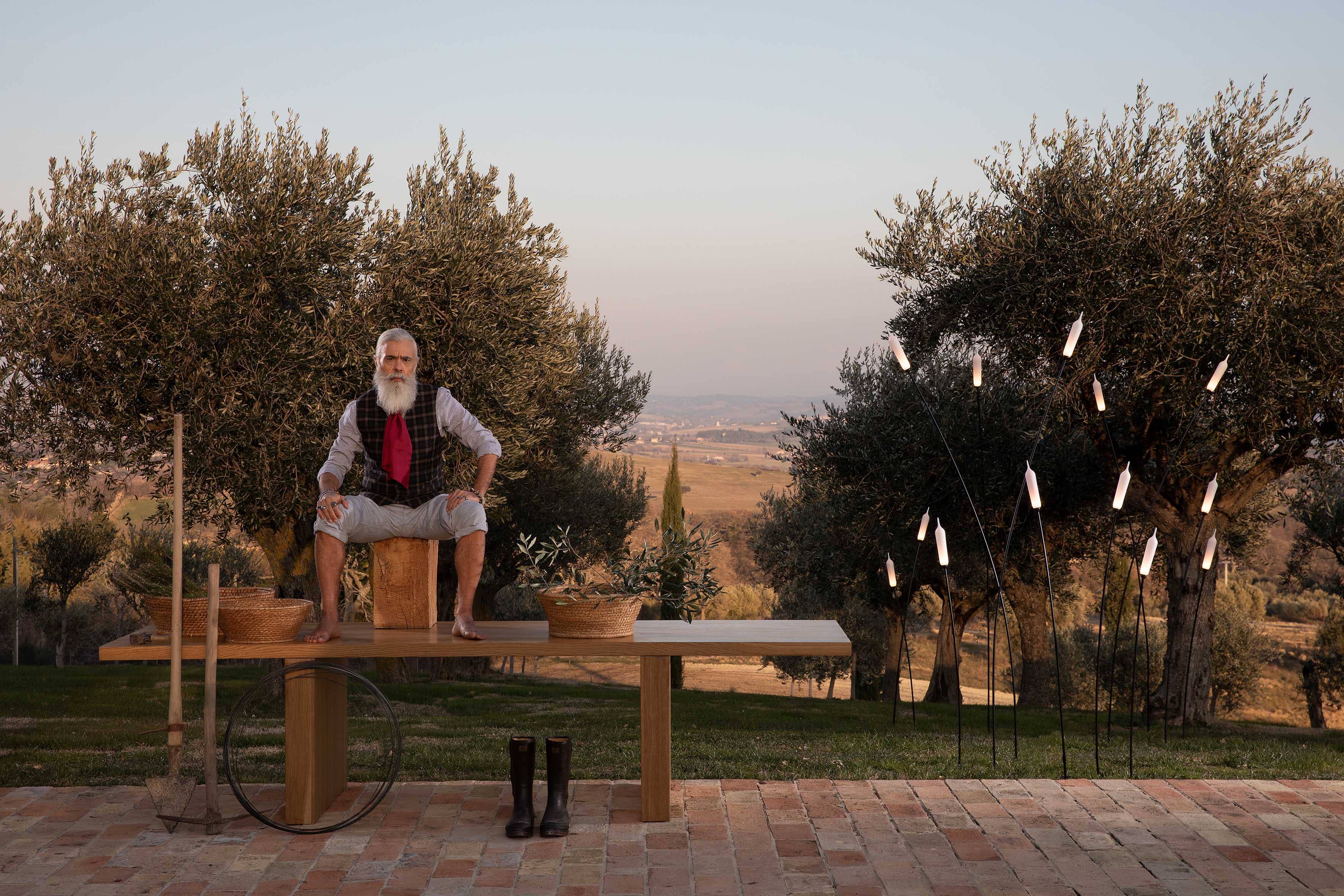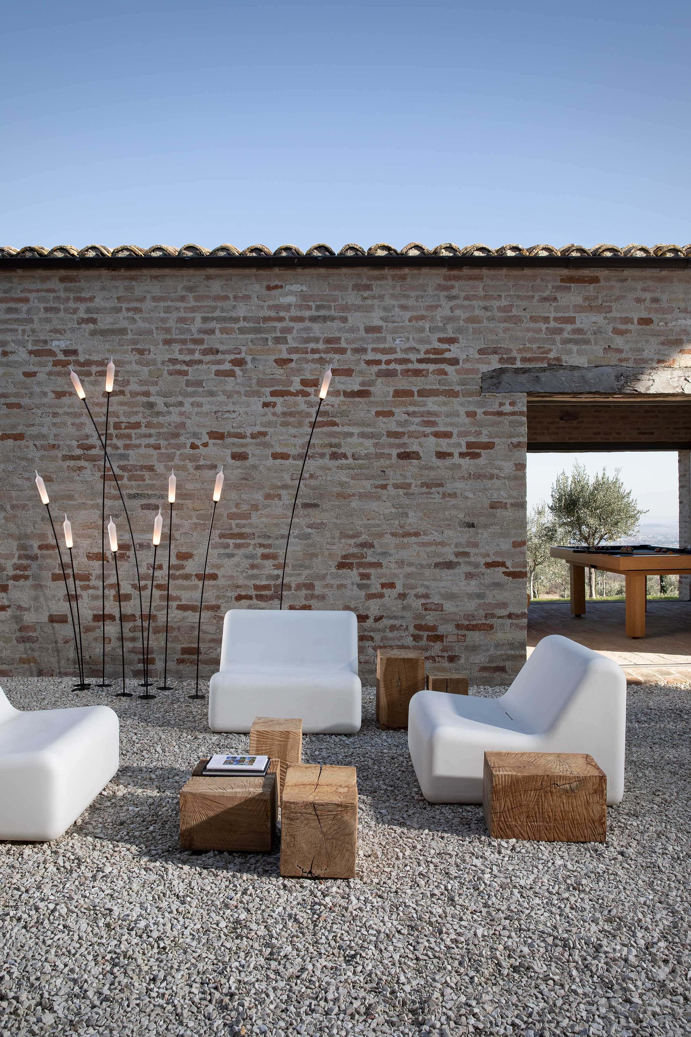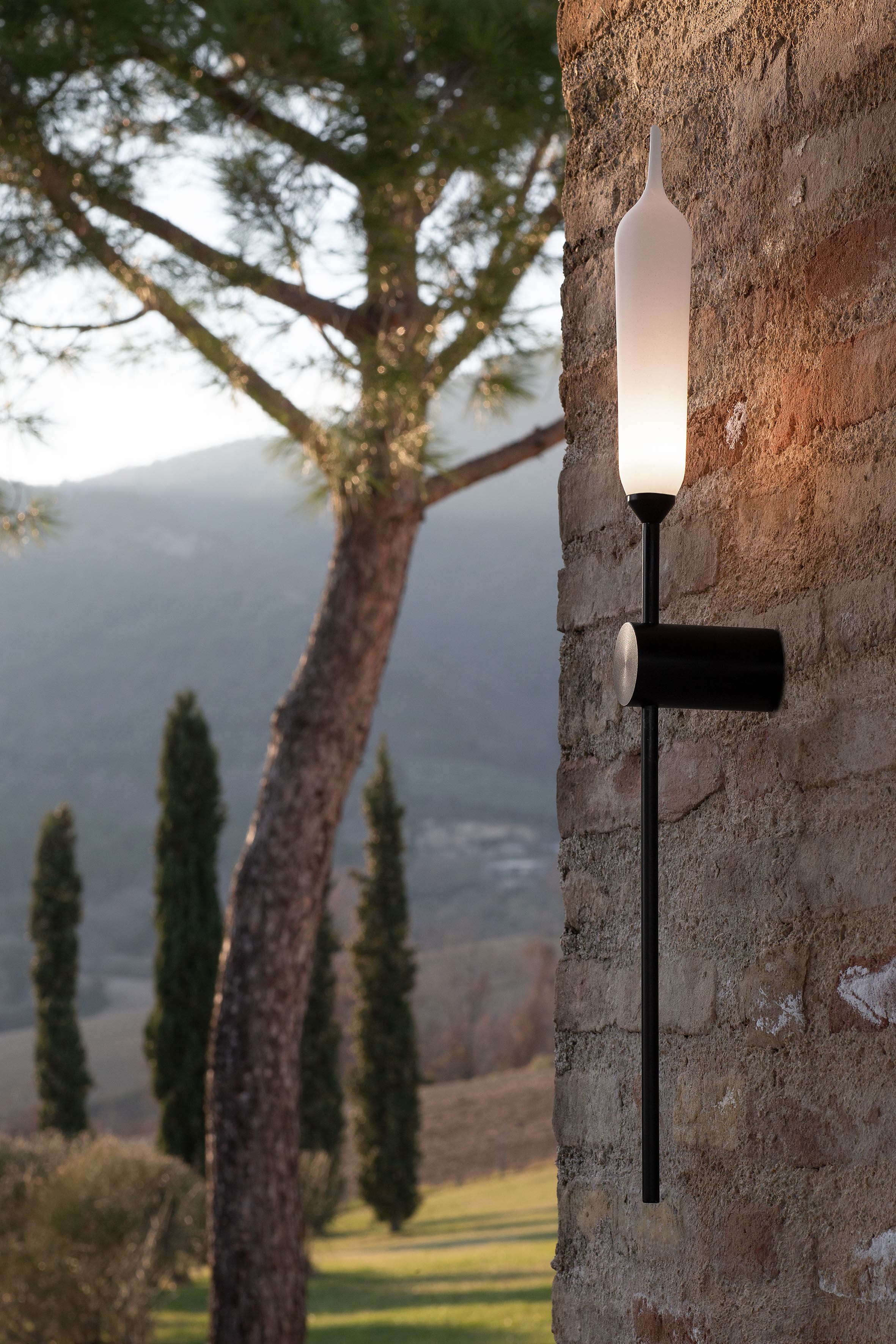 Nilo is a delicate collection for indoor and outdoor use. It consists of a matt white resin diffuser and light source on a slender, flexible aluminum stem. For interior use, Nilo is available in a single floor version and a composition version with five elements of three different heights on a matt black metal oval or rectangular base. For outdoor use, picket and applique types are available.