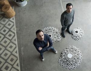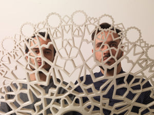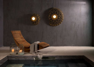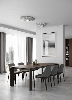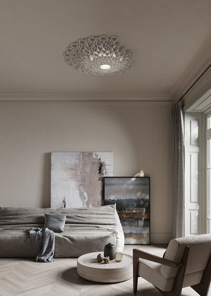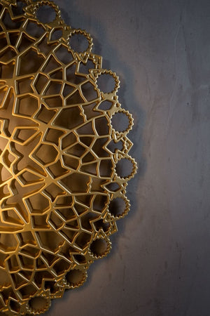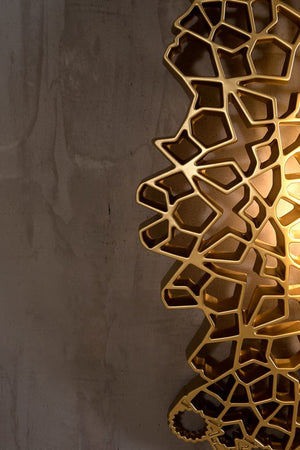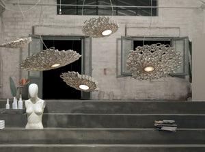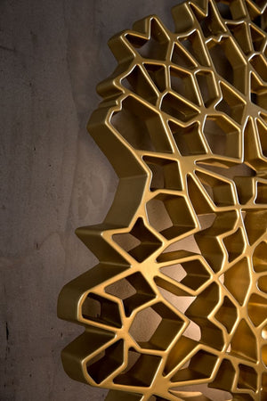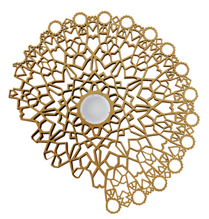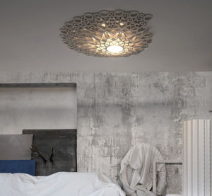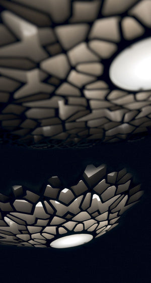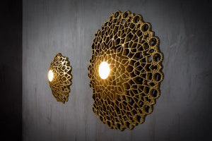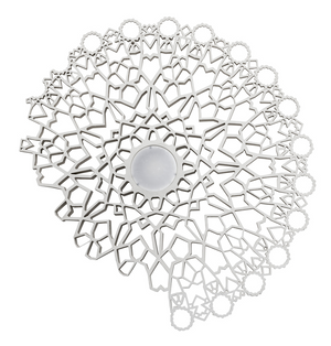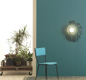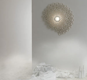 Notredame filters light like that radiating from the beautiful rose windows of a Gothic cathedral. The rosette structure of this highly decorative suspension or wall lamp is made of gold or white technopolymer. The technopolymer can be painted to fit seamlessly into the wall where the lamp is installed, creating a three-dimensional effect. The LED light source sends light directly from the central core and indirectly from the diffuser’s textured backlight. The lamp is available in two sizes and can be wall, ceiling or suspended.