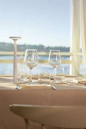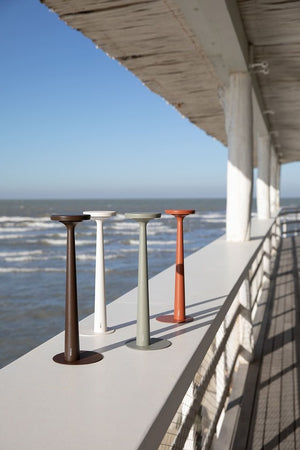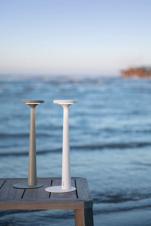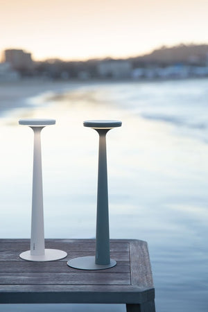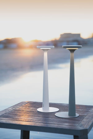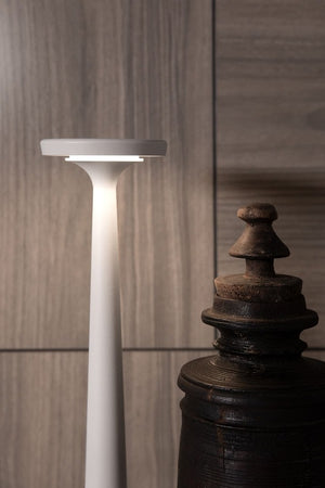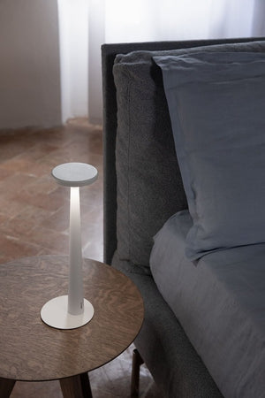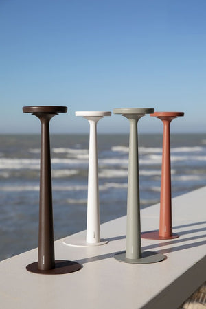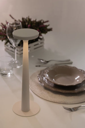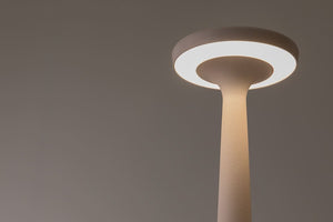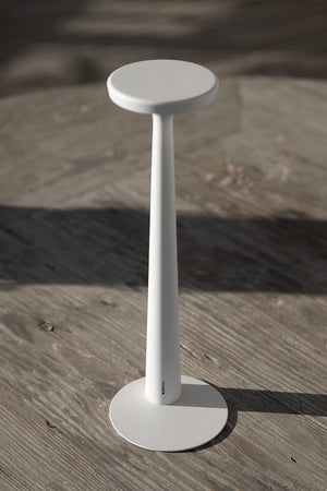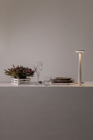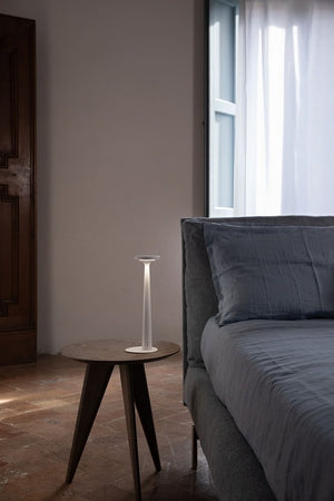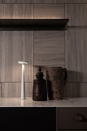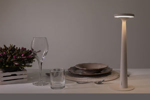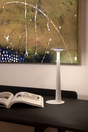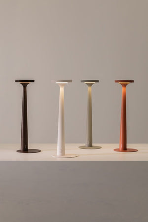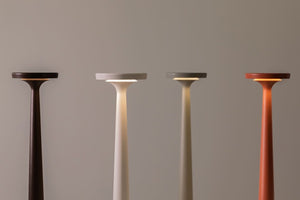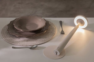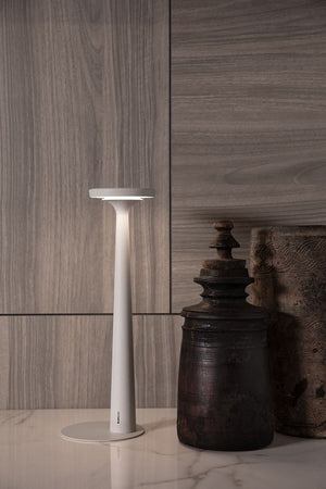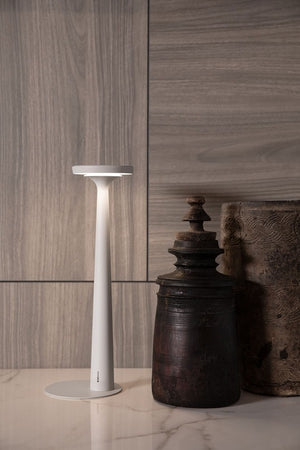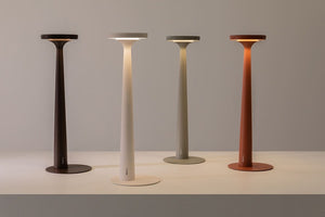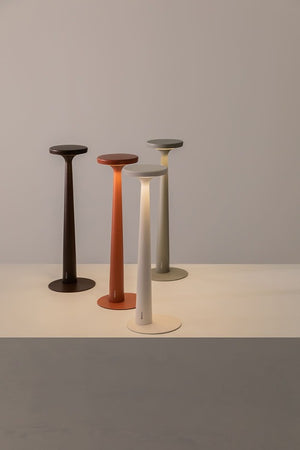 PAPIRIA is the rechargeable table lamp designed by Edmondo Testaguzza for Karman. A sleek, linear, and refined design characterizes this highly practical and functional lamp. Its soft lines make it a small gem crafted entirely in aluminum (except for the base plate, which is made of lacquered iron). PAPIRIA’s compact size allows it to be used even in very limited spaces. Thanks to a magnetic system, it can be securely anchored to any metallic surface. Alternatively, it can be fixed to a metal plate included in the package (which can be discreetly hidden under a tablecloth if needed). The touch control enables the lamp’s on/off function, adjustment of the most suitable light color temperature (2500, 3000, 4000 Kelvin), and dimming. Available in four embossed colors: white, dark brown, sage green, and ocher red. “It’s a companion I would never want to part with. Its beautiful light accompanies my time and makes it special.” Papiria can be used in the living area or next to the sofa in the living room, providing a relaxing light for reading or watching a movie. In the bedroom, it is perfect as a bedside light, replacing traditional lamps and creating a soft and soothing atmosphere. Ideal for restaurants or bistros to add an intimate glow to tables, as well as for cozy corners in winter gardens or pergolas.