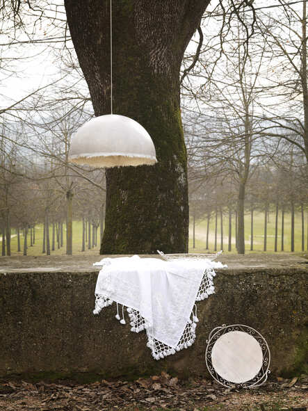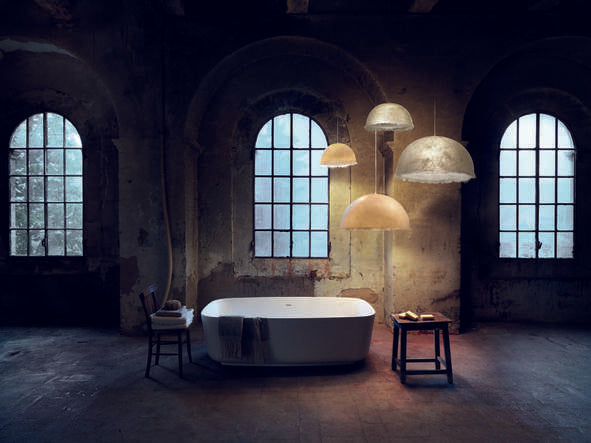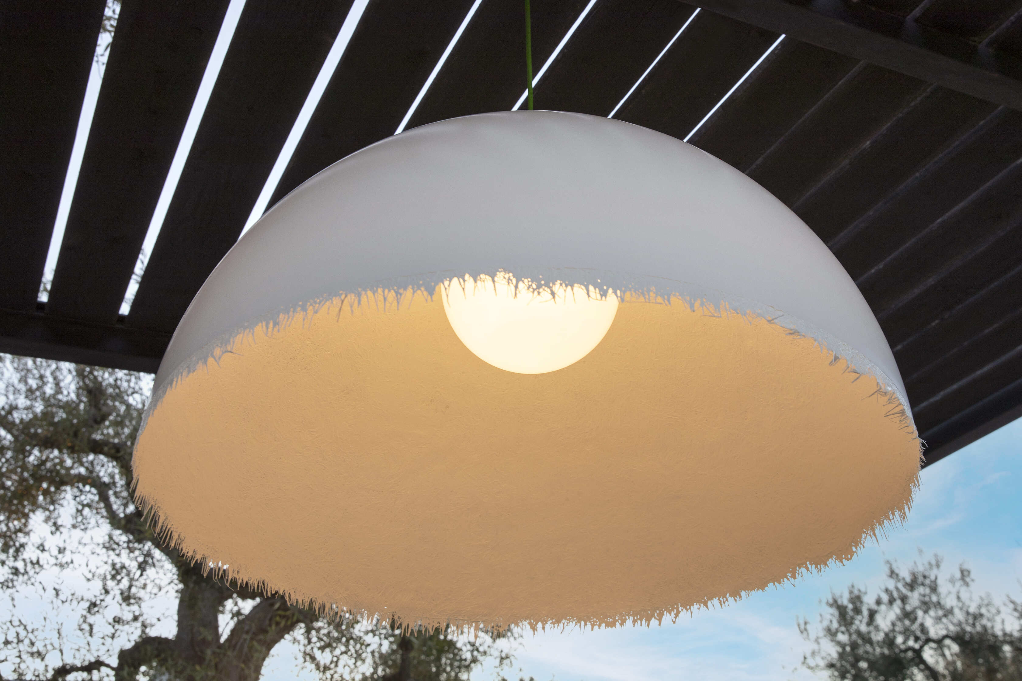 A series of hanging lamps made of white fiberglass for interior and exterior use. The structure is light, and the shape of the cap creates a brilliant light that propagates softly in the environment through the thousand shades of its substance. Available in two sizes.