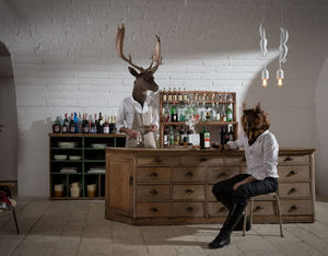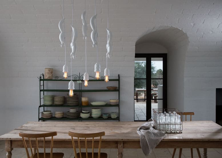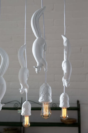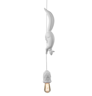 An ironical suspension, combining an acorn-shaped lampshade in matt white ceramic decorated in relief (Sherwood) and one or two thick-tailed squirrels walking on wires, also in white ceramic (Robin).