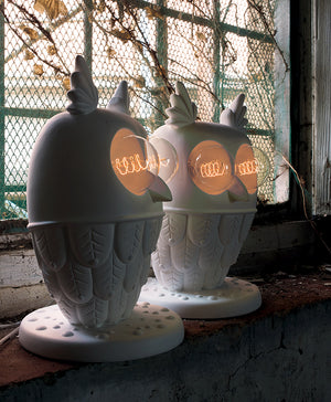 The table and wall lamp in matt white ceramic owl-shaped from Karman’s Zoo collection has two big bright eyes. It captures the view when lighted on, and it is a cute decorative element when turned off.