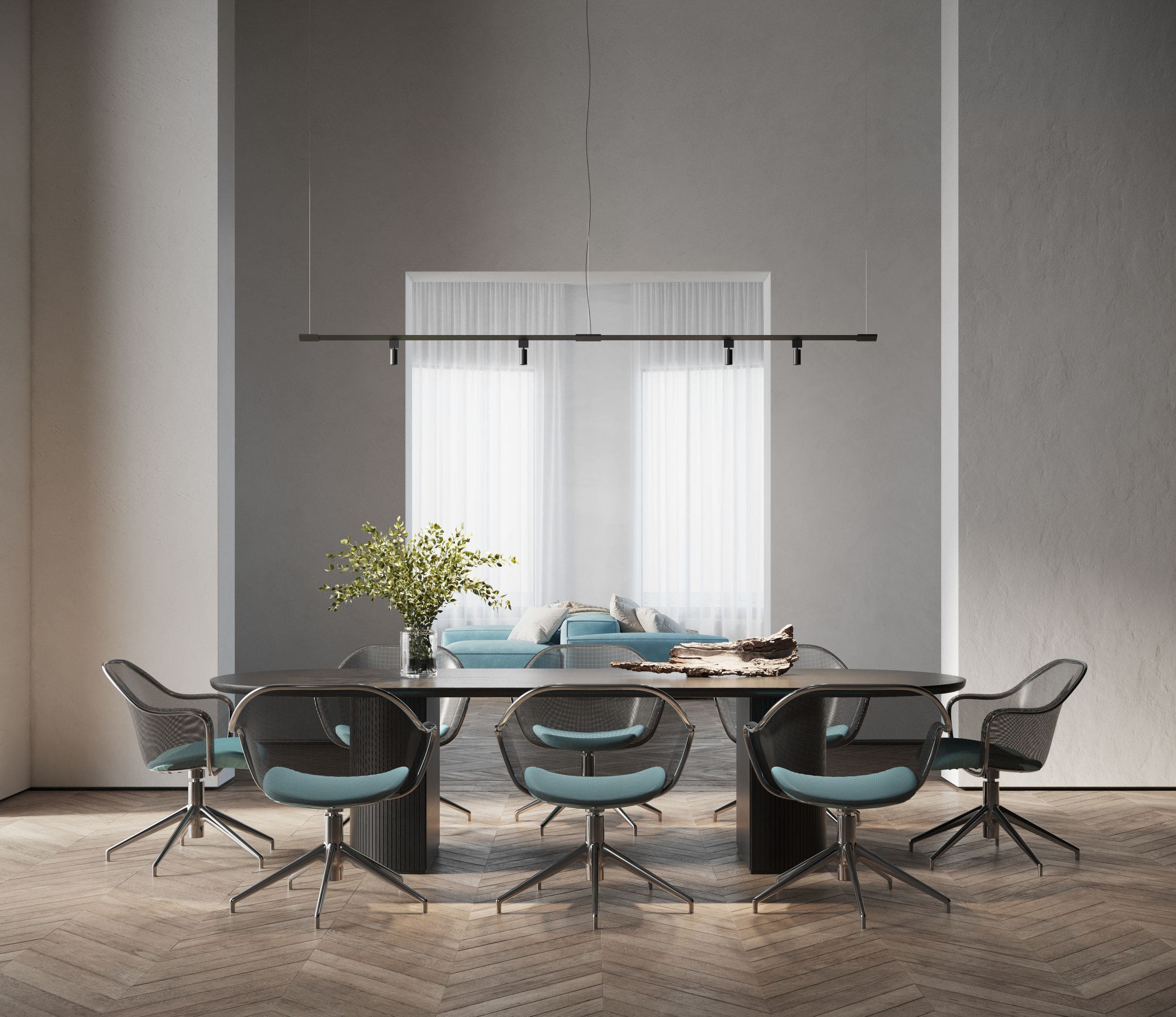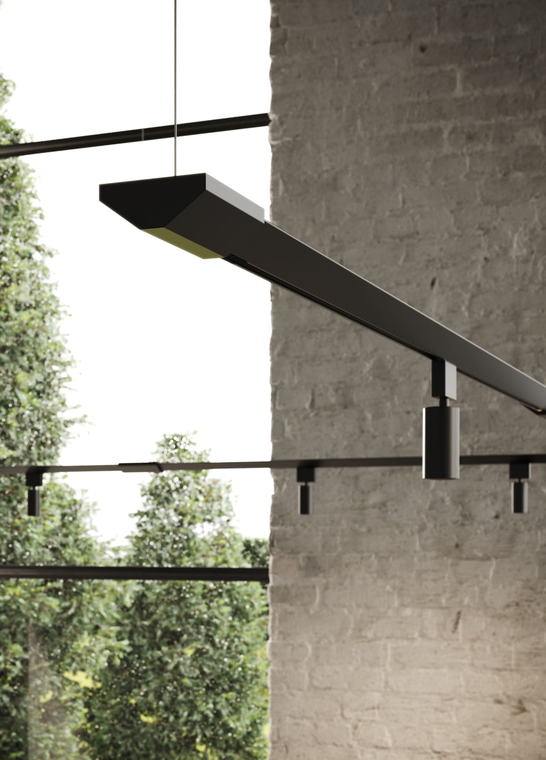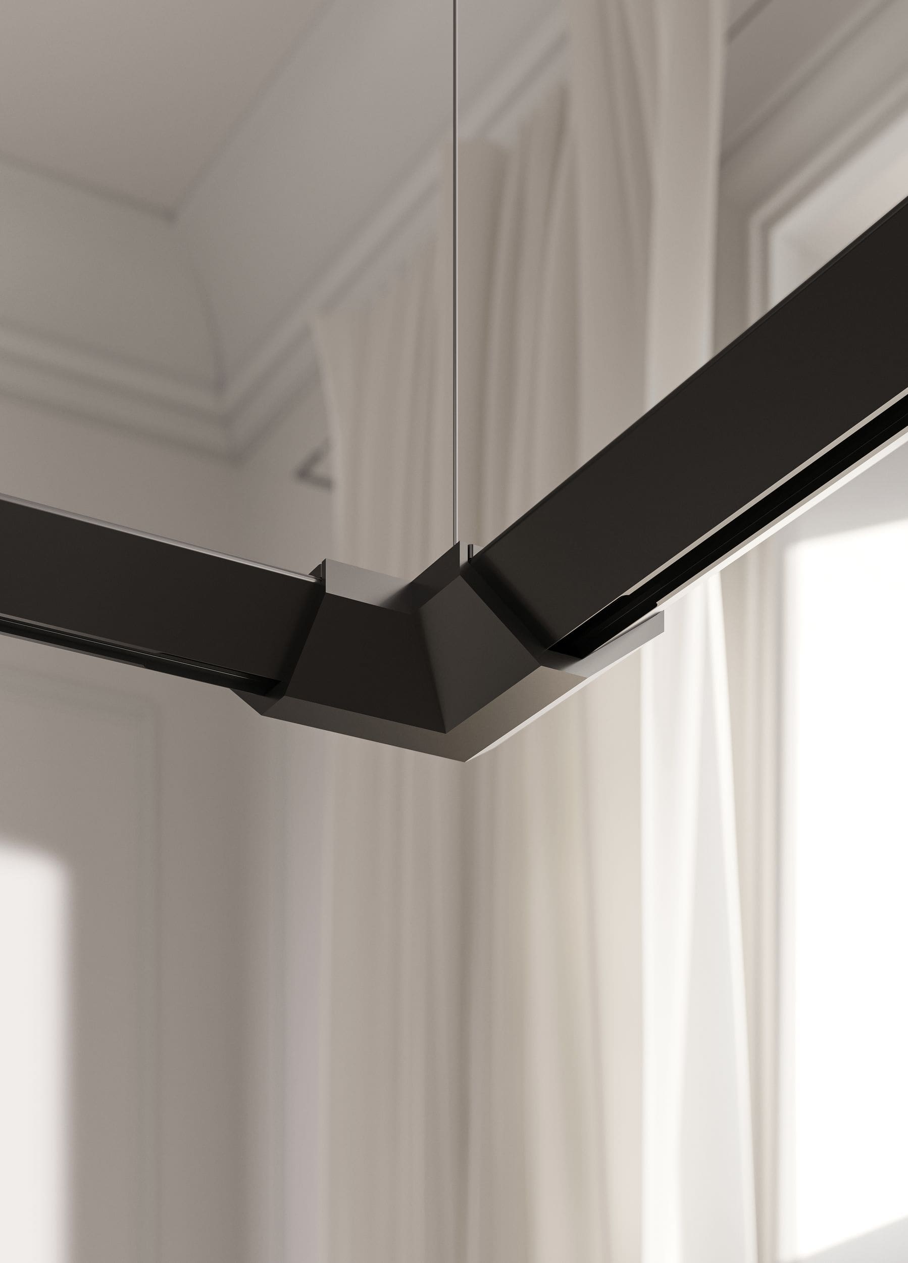 Turn it represents the maximum integration of light into the architectural space. Turn it has a linear and light design. The suspension structure is modular and can be configured in various combinations with angular and linear joints. A sliding system in the profile allows the possibility to insert spotlights from below. With Turn It you can create countless configurations for any design need.