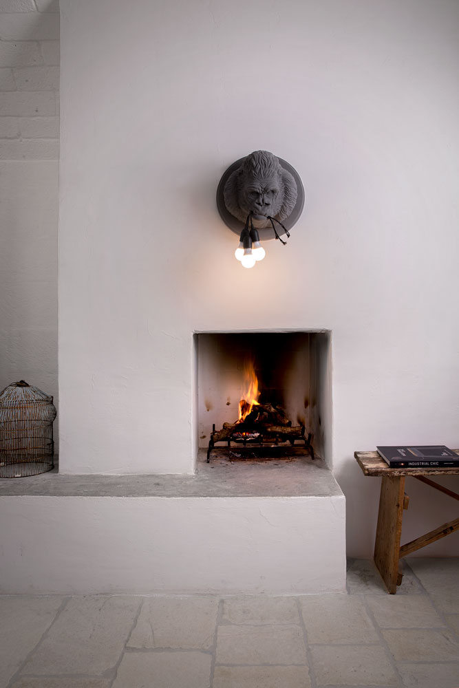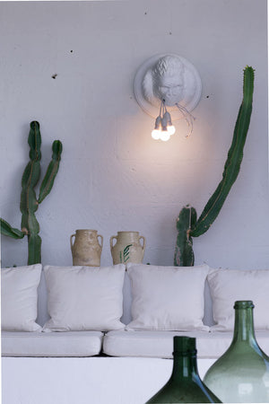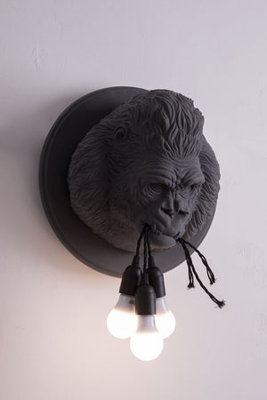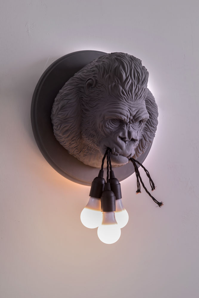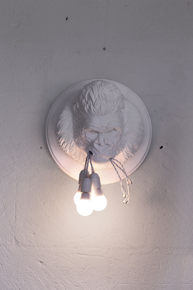 This wall lamp from the Karman Zoo collection is made of grey or matt white ceramic, embossed with the fur of one of the most powerful icons in film history, the gorilla. In a clamp of determination are held three cables in white or black fabric for three bulbs.