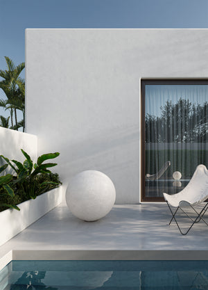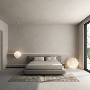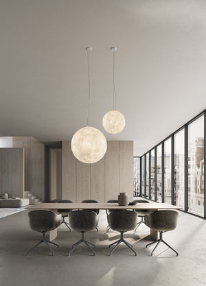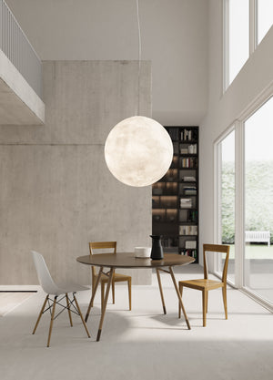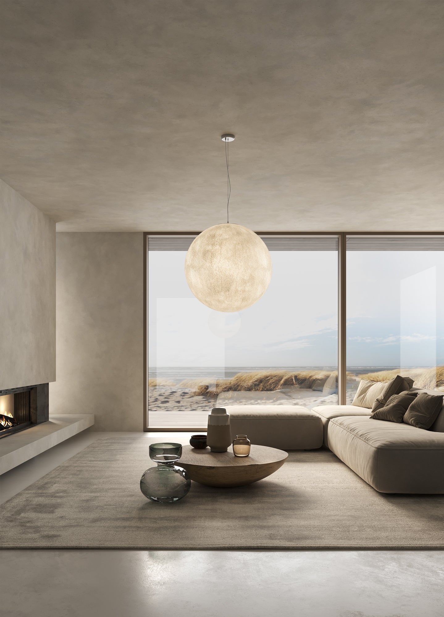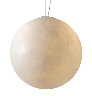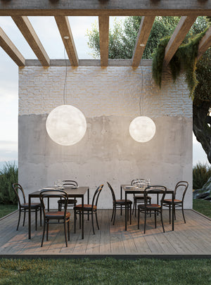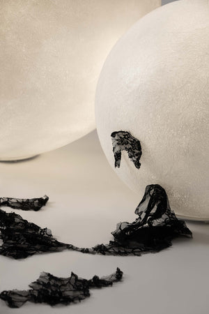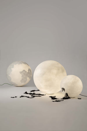The evocative power of the moon transforms into suspension and floor lamps. The white fiberglass sphere is covered with macramé fabric, creating a bright and poetic piece of furniture. Suspended, placed on the ground, or in the middle of a meadow, Ululì and Ululà come to life when lighted on, creating warm amber tones. Small (Ululì) and large (Ululà) versions can be used indoor and outdoor.