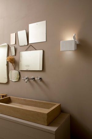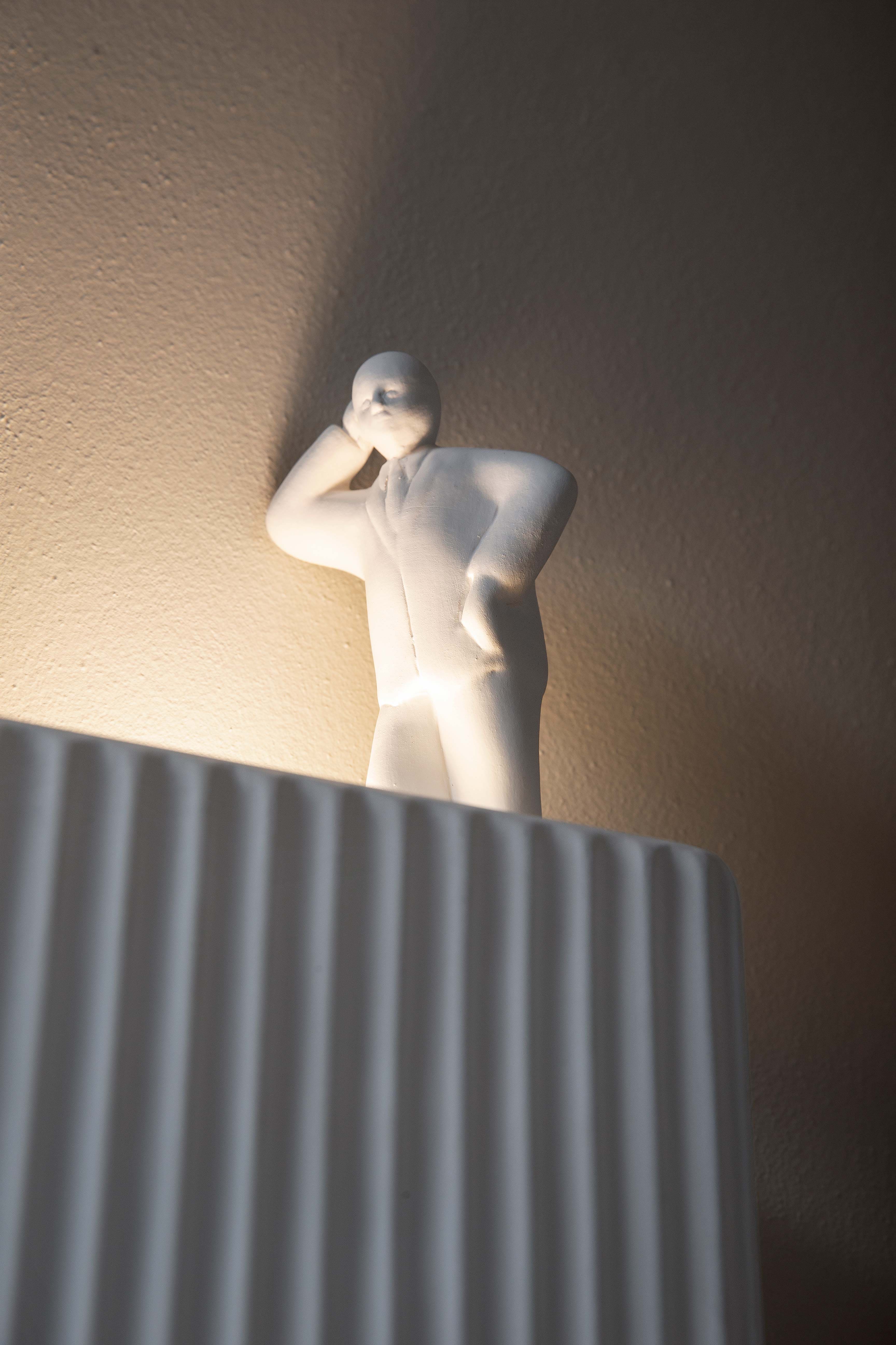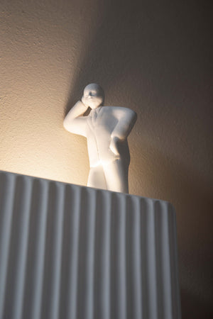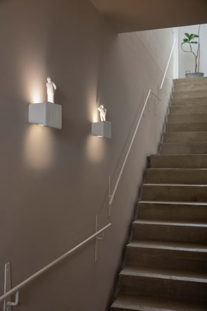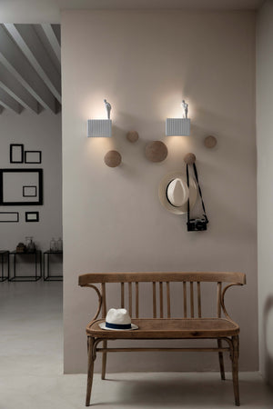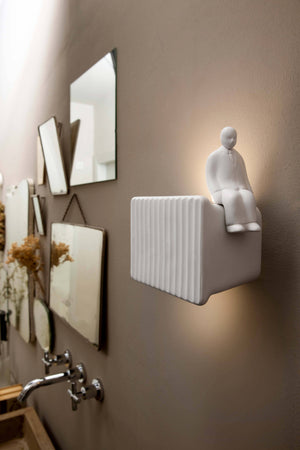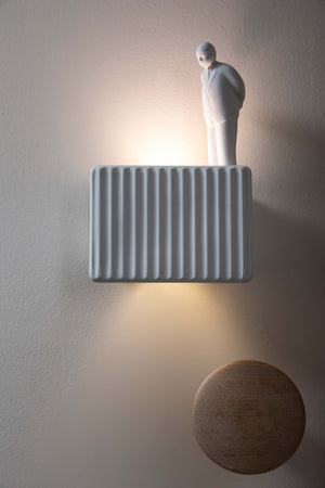 Parallelepiped wall sconce made of white ceramic. The front is decorated with a pleated pattern and the edges are soft, enhancing the refined craftsmanship. The natural color variation of light and shadow requires no finishing touches, and three white ceramic men can be placed on it in three different poses: sitting, standing, and walking. The light source is dual, allowing for multi-directional lighting.