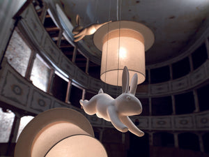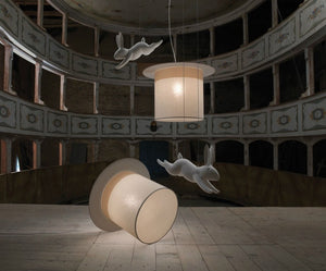 Diffused light filters from the cylindrical white linen suspension and, almost magically and surprisingly, Silvan seems to emerge. White matt ceramic rabbits are decorative accessories to be combined with the suspension.