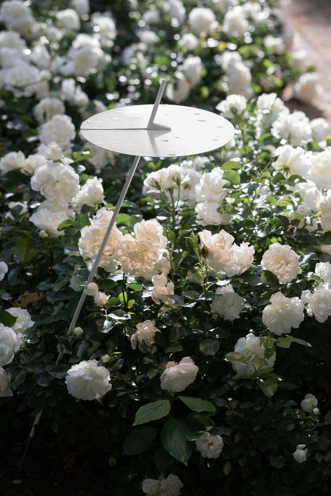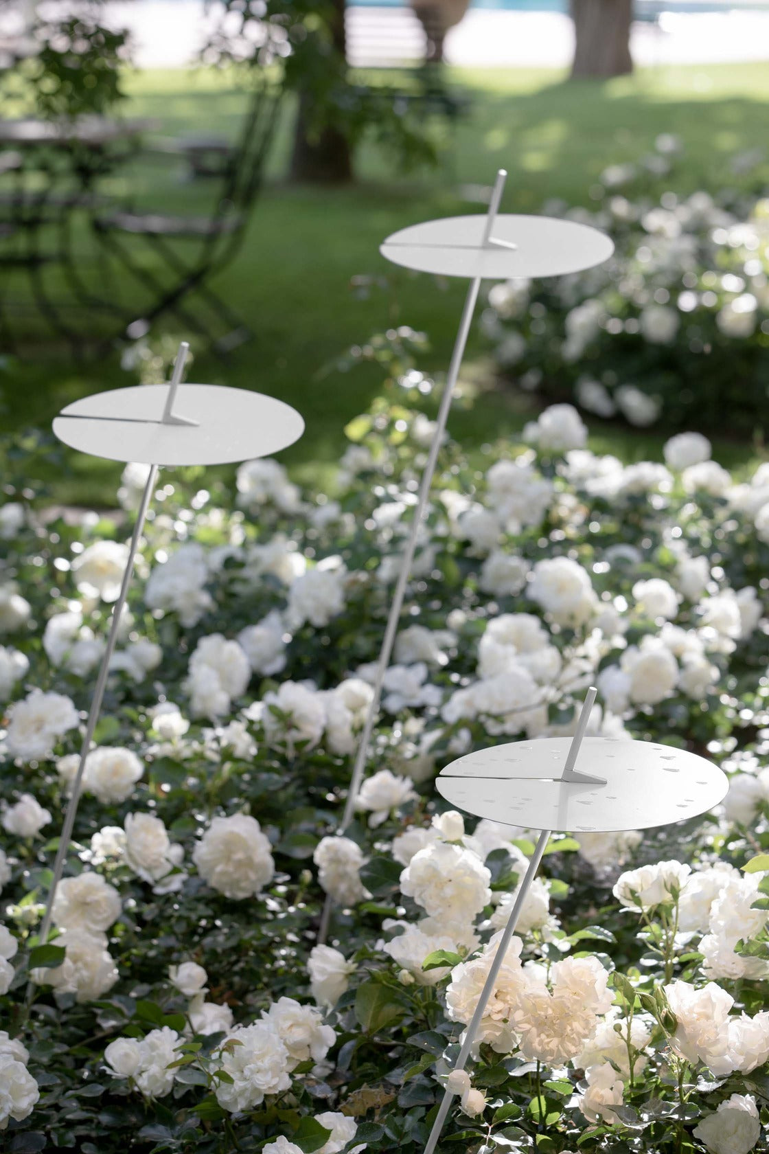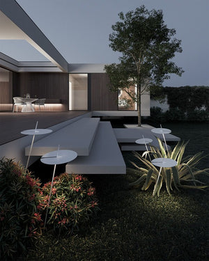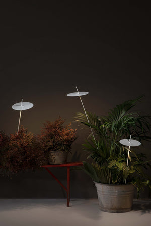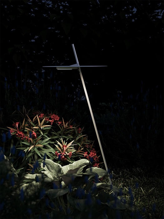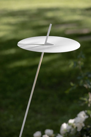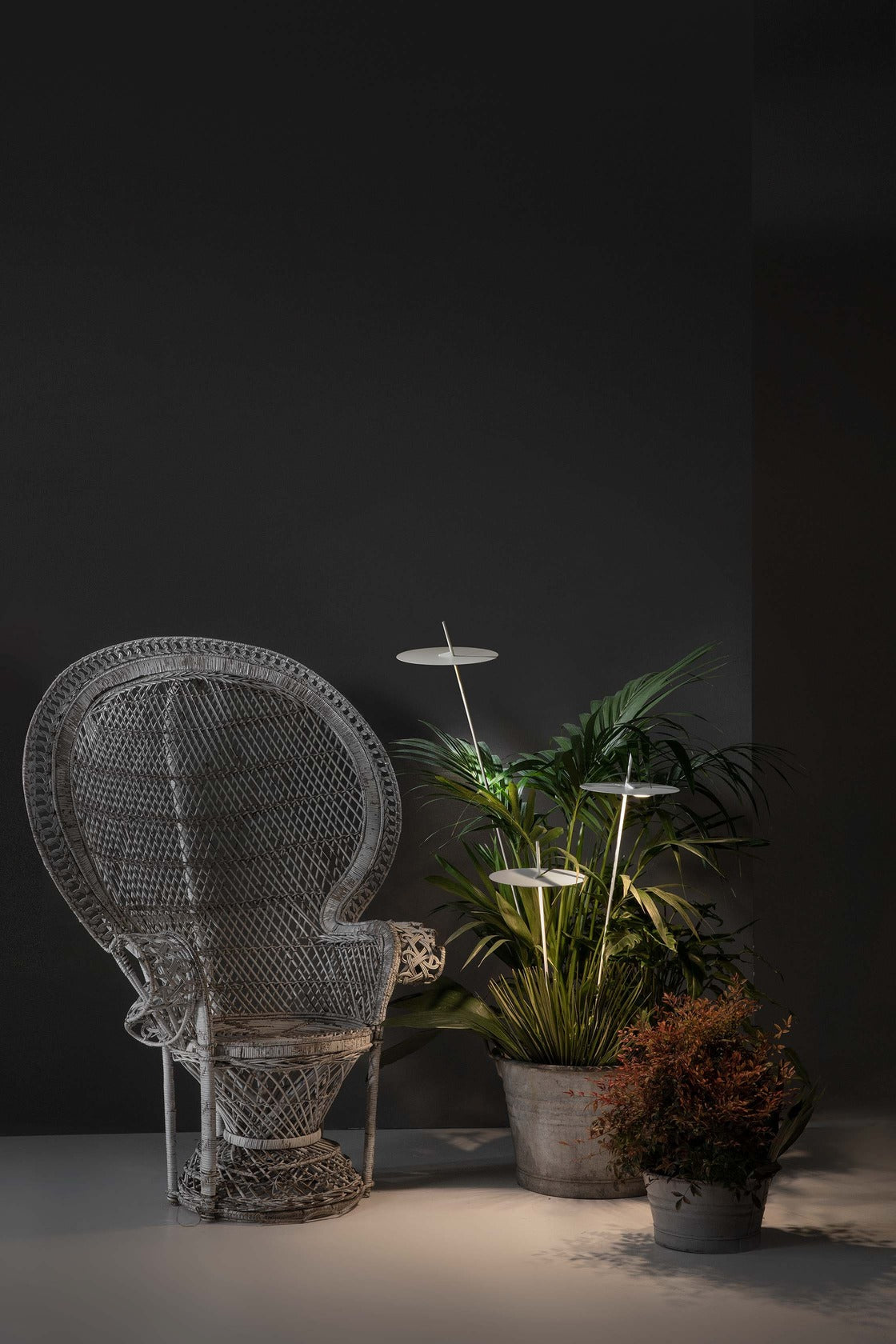 The Xana floor lamp is lightweight and made for outdoor use. Its disk that hides the LED light source at the bottom has the features of a delicate white water lily. Thanks to its variable-height pickets, you can light up outdoor paths, or you can plant the lamp like a flower among the vegetation of your terrace or garden.