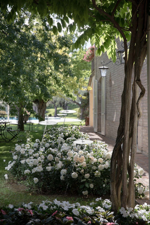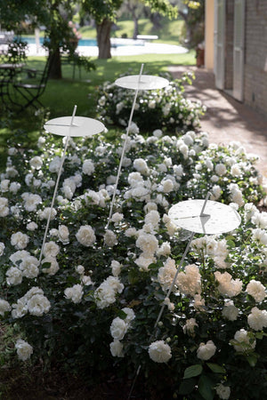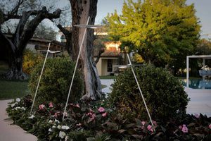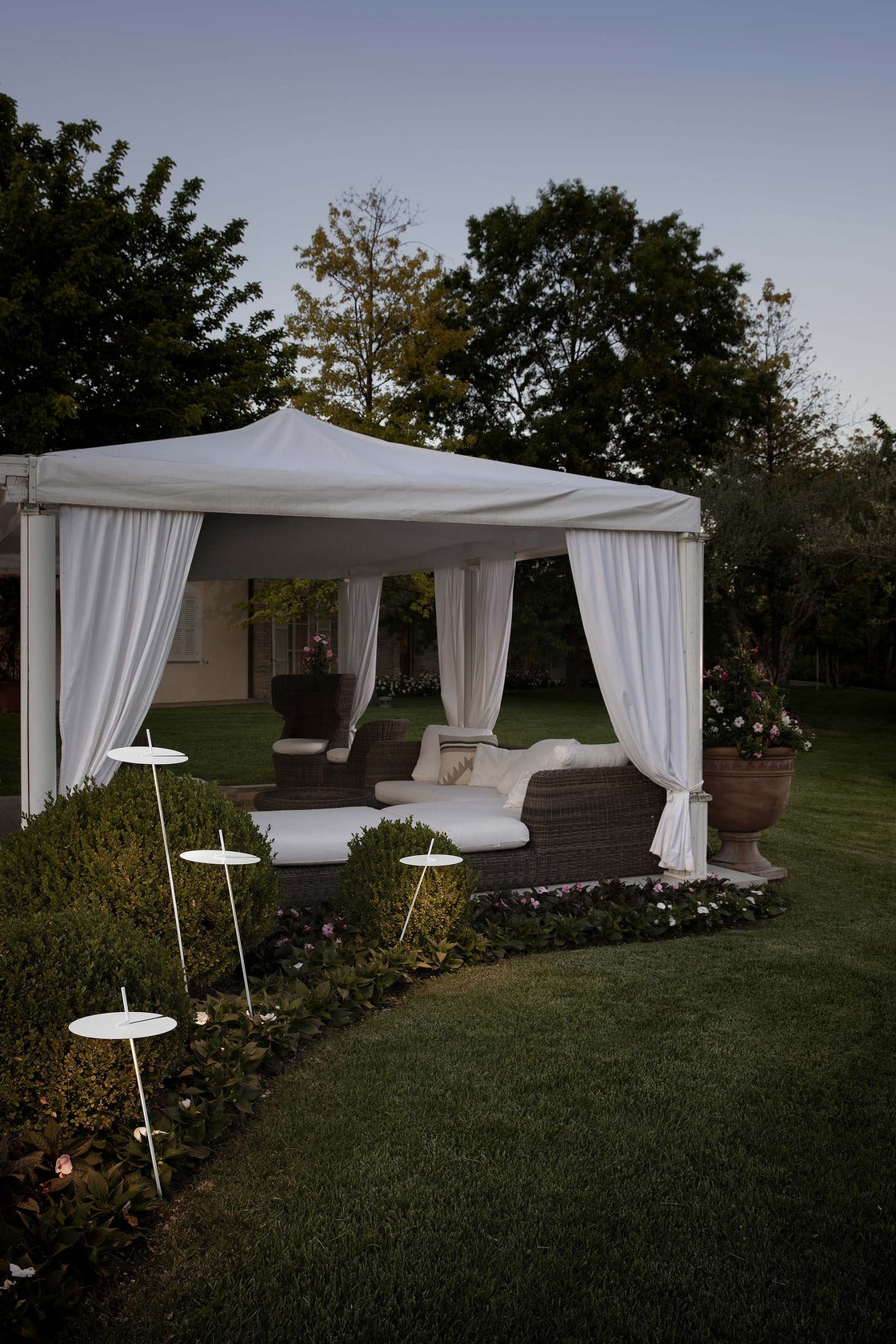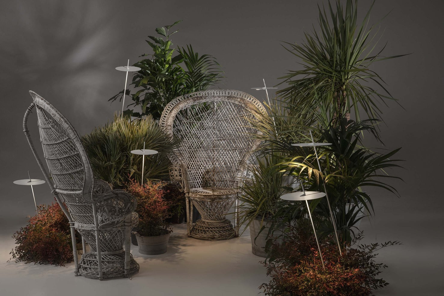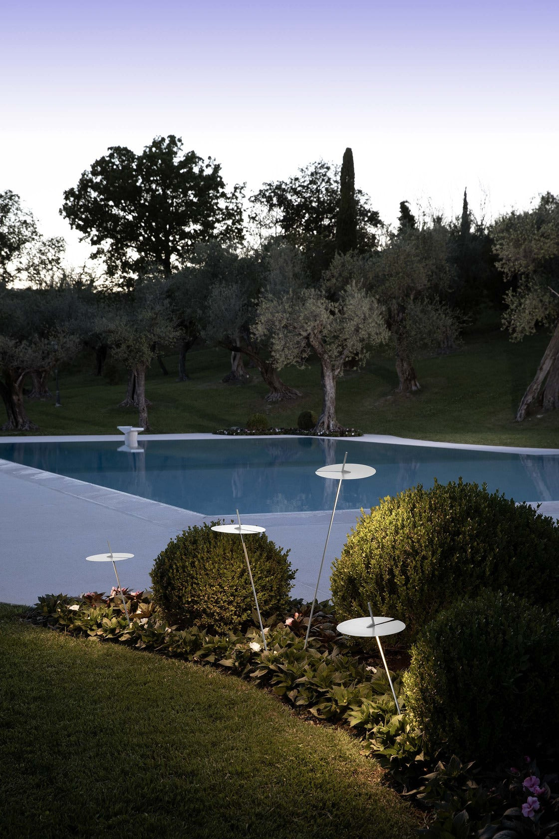 The Xana floor lamp is lightweight and made for outdoor use. Its disk that hides the LED light source at the bottom has the features of a delicate white water lily. Thanks to its variable-height pickets, you can light up outdoor paths, or you can plant the lamp like a flower among the vegetation of your terrace or garden.
