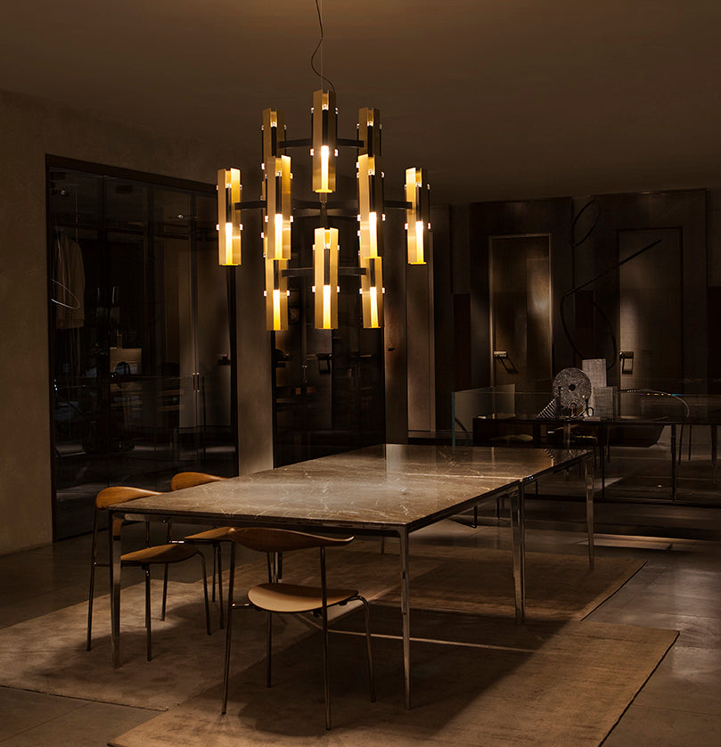 Description: A slightly Deco inspired lamp. The main body is in black coating and the light is spread through two plexiglass prisms and it’s wrapped into three rectangular brushed brass foils. It is available in different compositions: single or bunch suspension, chandeliers in two different dimension, single or double wall lamp.