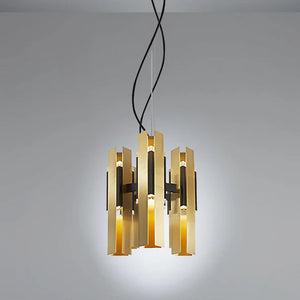 Description: A slightly Deco inspired lamp. The main body is in black coating and the light is spread through two plexiglass prisms and it’s wrapped into three rectangular brushed brass foils. It is available in different compositions: single or bunch suspension, chandeliers in two different dimension, single or double wall lamp.