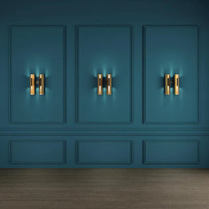 Description: A slightly Deco inspired lamp. The main body is in black coating and the light is spread through two plexiglass prisms and it’s wrapped into three rectangular brushed brass foils. It is available in different compositions: single or bunch suspension, chandeliers in two different dimension, single or double wall lamp.