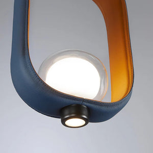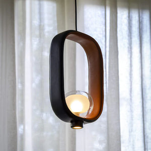 Description: Collection of lamps inspired by the classic Chinese lanterns. The particular bi-dimensional structure is made by powder coated painted metal on the outside, while the inside color is sand gray. A new version in a two-coloured leather has enriched the collection. The light source is located inside a double-side borosilicate glass diffuser, while the suspensions have an additional integrated LED light source in order to create a direct illumination downwards.