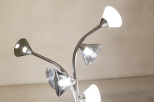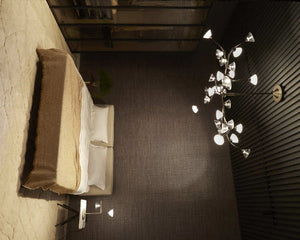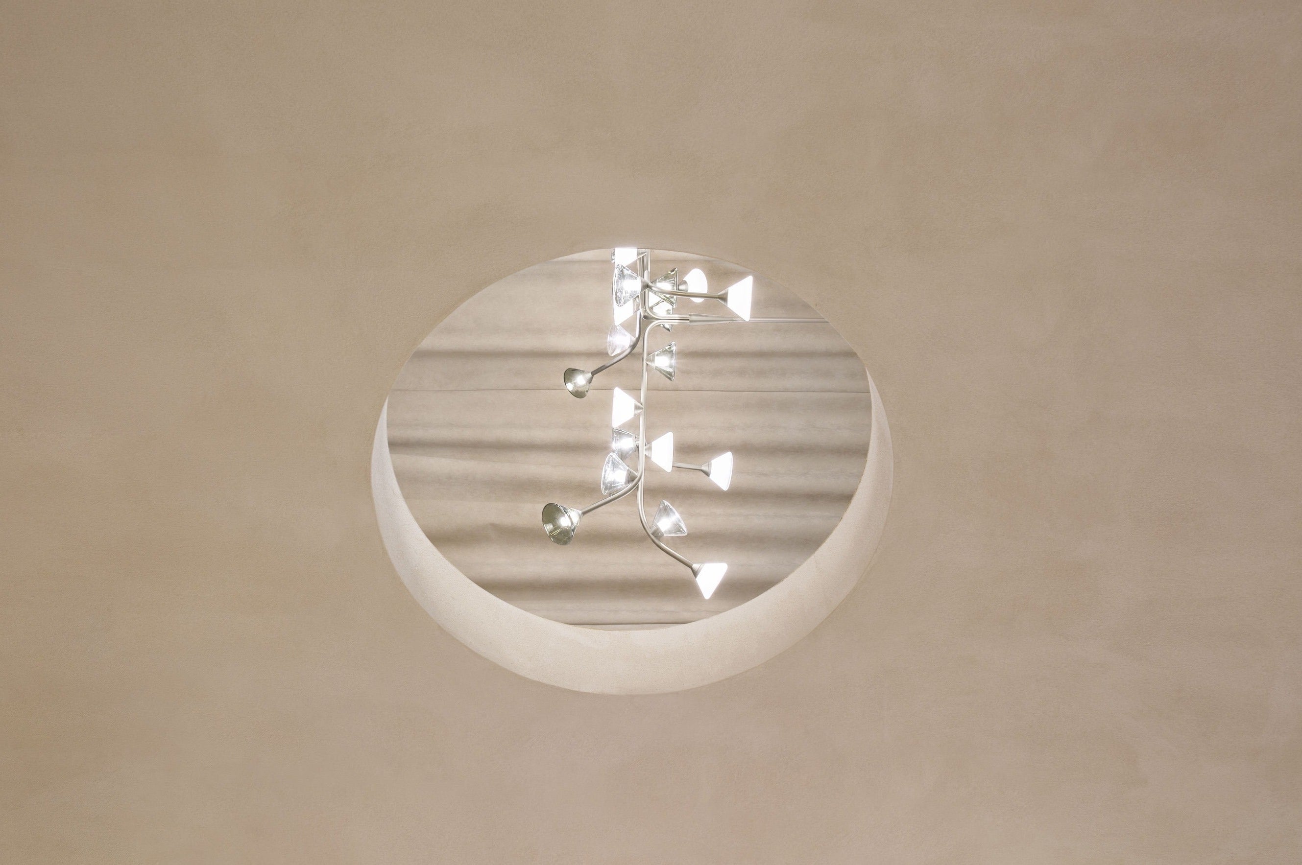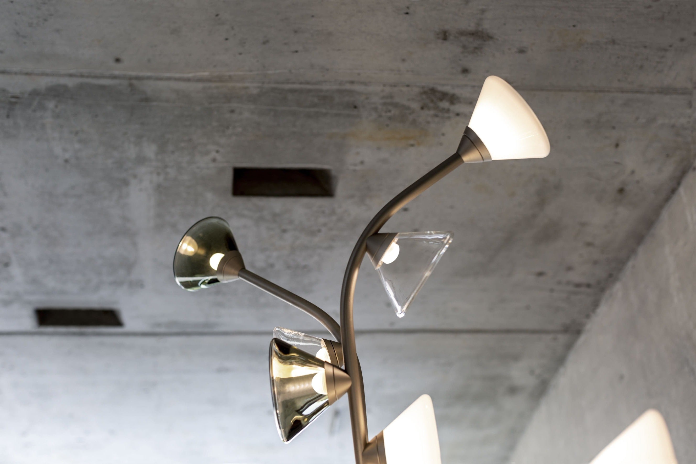 Description: Inspired and characterized by the natural world, the Linfa family of lamps designed by Federico Peri unfolds on arms so sinuous and elegant as to evoke the veins that run through the leaves, with bright points of light that shine like dew drops. In this family, made up of pendant, floor, table lamps and wall sconces, the refined branches are available in gold, titanium or matt nickel finishes, while the light sources, made of Murano glass, are available in smoky and transparent finishes or milky white.