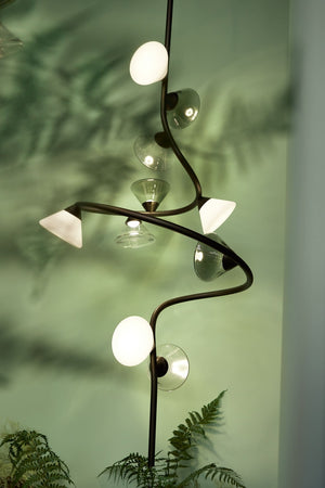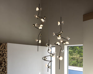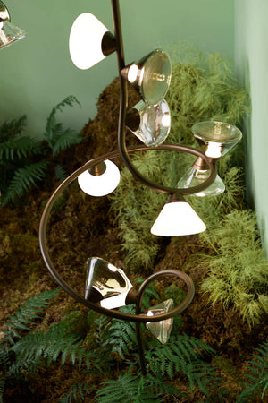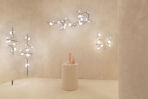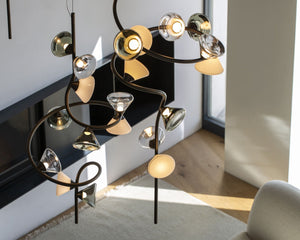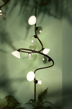 Description: Inspired and characterized by the natural world, the Linfa family of lamps unfolds on arms so sinuous and elegant as to evoke the veins that run through the leaves, with bright points of light that shine like dew drops. Available in pendant, floor, table and wall versions, the refined branches come in gold, titanium or matt nickel finishes. The light sources, crafted from Murano glass, are available in smoky, transparent, or milky white finishes.