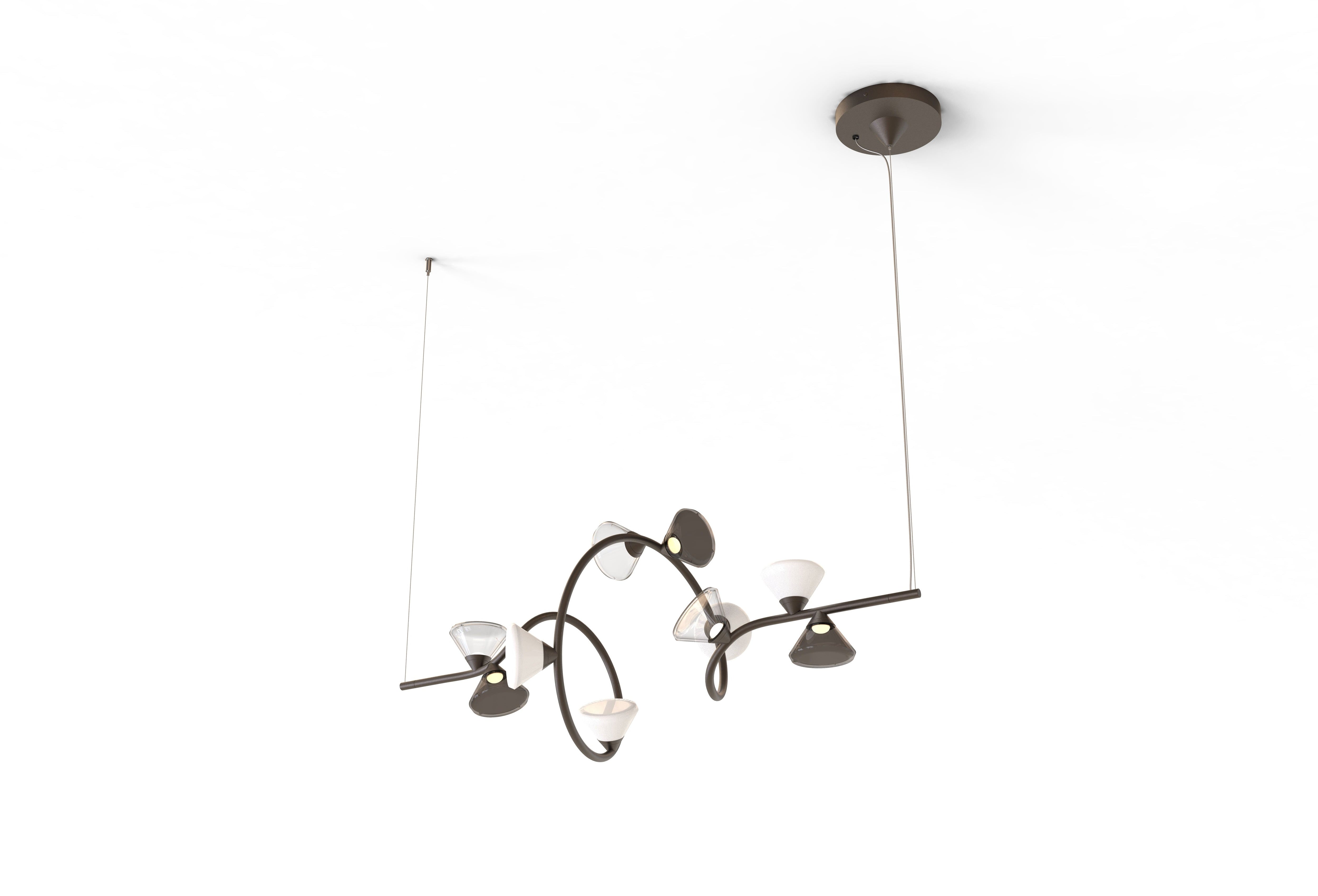 Description: Inspired and characterized by the natural world, the Linfa family of lamps designed by Federico Peri unfolds on arms so sinuous and elegant as to evoke the veins that run through the leaves, with bright points of light that shine like dew drops. In this family, made up of pendant, floor, table lamps and wall sconces, the refined branches are available in gold, titanium or matt nickel finishes, while the light sources, made of Murano glass, are available in smoky and transparent finishes or milky white.