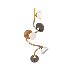 Description: Inspired and characterized by the natural world, the Linfa family of lamps designed by Federico Peri unfolds on arms so sinuous and elegant as to evoke the veins that run through the leaves, with bright points of light that shine like dew drops. In this family, made up of pendant, floor, table lamps and wall sconces, the refined branches are available in gold, titanium or matt nickel finishes, while the light sources, made of Murano glass, are available in smoky and transparent finishes or milky white.